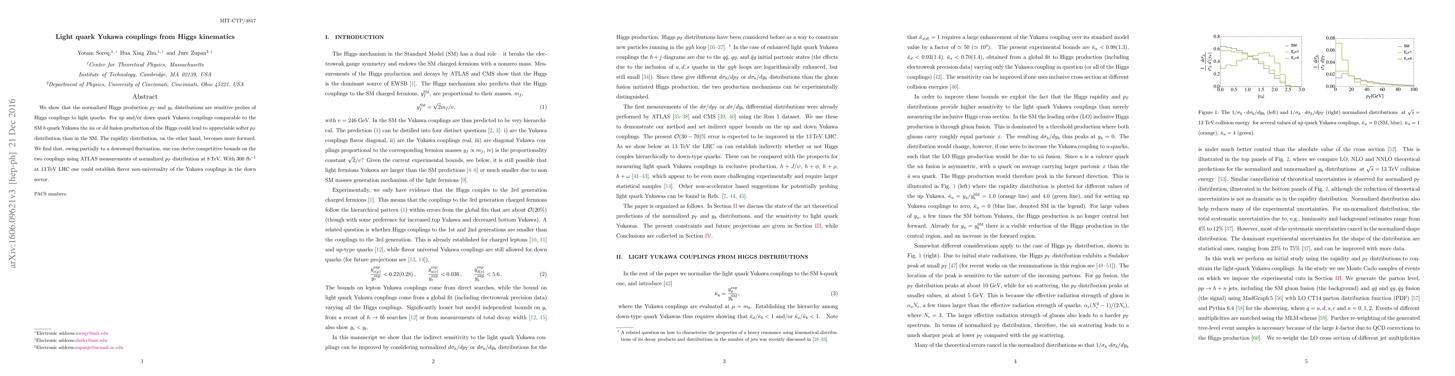 This paper demonstrates that the normalized transverse momentum and rapidity distributions of the Higgs boson can reveal deviations in light quark Yukawa couplings, particularly for up and down quarks. Using ATLAS data at 8 TeV, it shows competitive bounds on these couplings, and predicts that higher luminosity at 13 TeV will allow for the detection of flavor non-universality in the down quark sector.