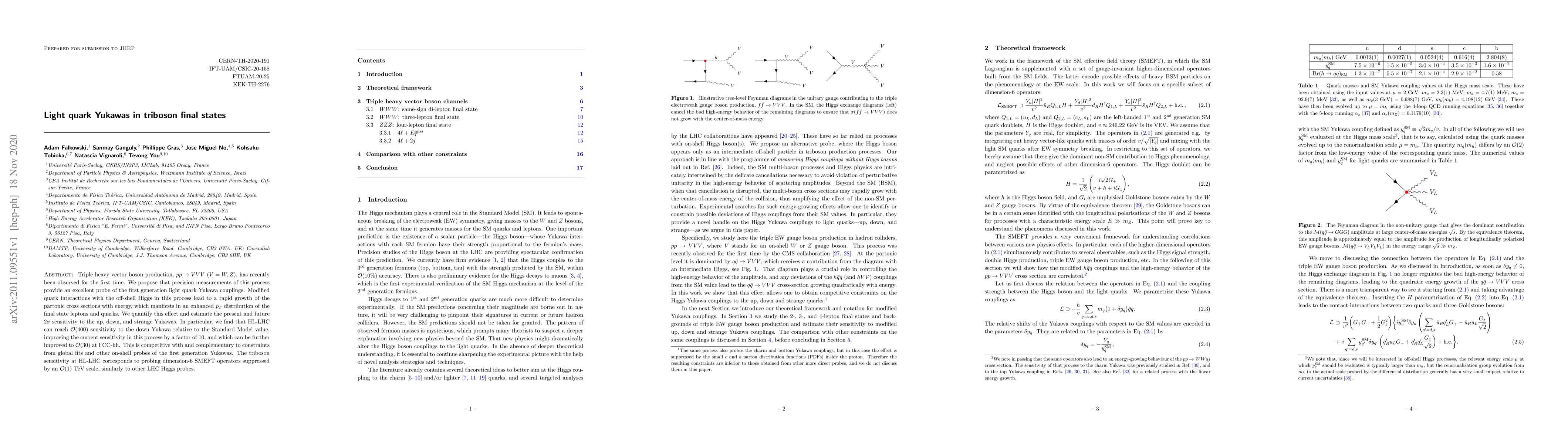 This paper explores the potential of precision measurements of triple heavy vector boson production to probe the first generation light quark Yukawa couplings, finding that the High-Luminosity Large Hadron Collider (HL-LHC) can achieve a 400-fold improvement in sensitivity to the down Yukawa, and further improvements are possible at the Future Circular Collider (FCC-hh).