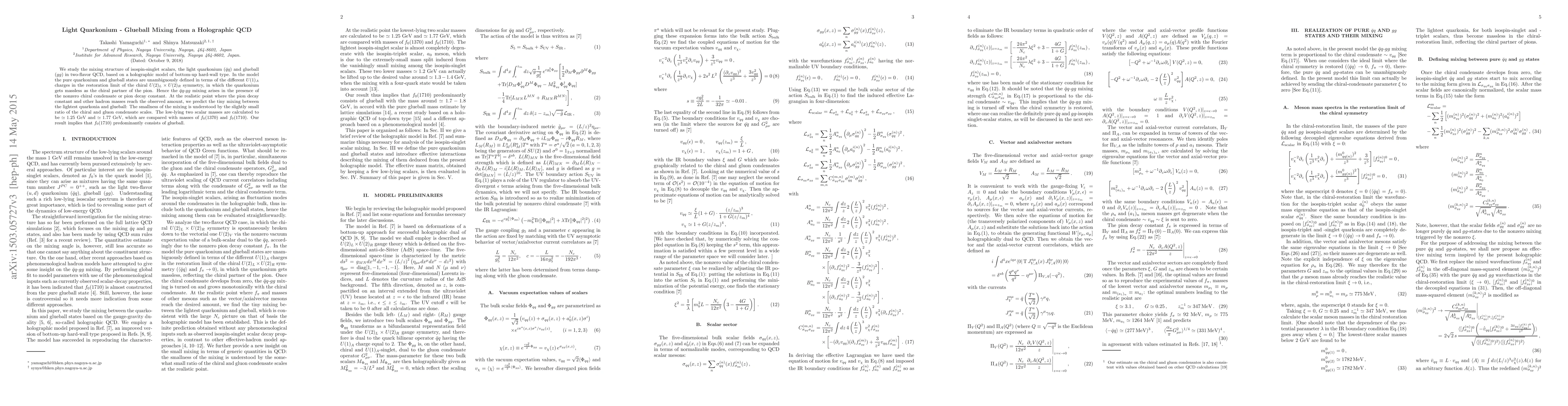 This paper investigates the mixing between light quarkonium and glueball states in two-flavor QCD using a holographic QCD model, predicting minimal mixing due to the small ratio of chiral and gluon condensate scales. The calculated low-lying scalar masses align with observed $f_0(1370)$ and $f_0(1710)$ mesons, suggesting $f_0(1710)$ is primarily a glueball.