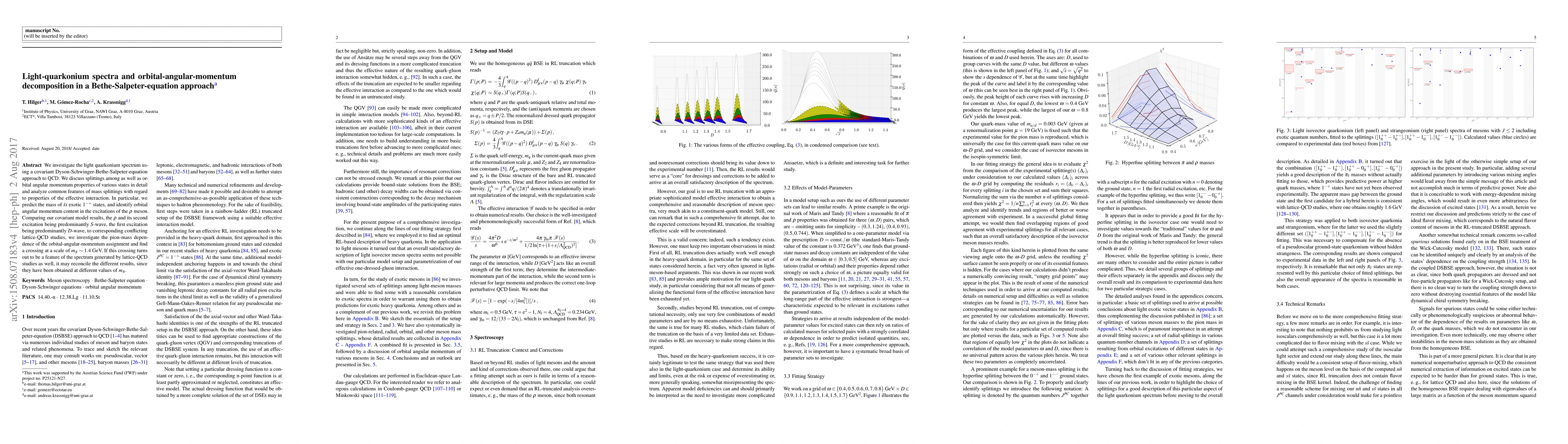 We investigate the light quarkonium spectrum using a covariant Dyson-Schwinger-Bethe-Salpeter-equation approach to QCD. We discuss splittings among as well as orbital angular momentum properties of various states in detail and analyze common features of mass splittings with regard to properties of the effective interaction. In particular, we predict the mass of sbars exotic 1-+ states, and identify orbital angular momentum content in the excitations of the rho meson. Comparing our covariant model results, the rho and its second excitation being predominantly S-wave, the first excitation being predominantly D-wave, to corresponding conflicting lattice-QCD studies, we investigate the pion-mass dependence of the orbital-angular-momentum assignment and find a crossing at a scale of $m_\pi$ ~ 1.4 GeV. If this crossing turns out to be a feature of the spectrum generated by lattice-QCD studies as well, it may reconcile the different results, since they have been obtained at different values of $m_\pi$.