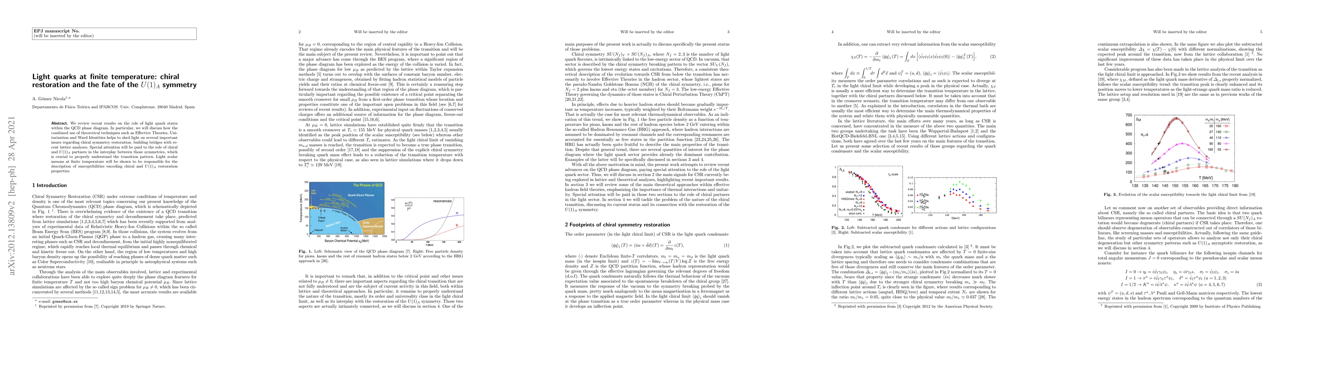 This paper reviews the role of light quarks in the QCD phase diagram, focusing on chiral symmetry restoration and the fate of the $U(1)_A$ symmetry. It employs theoretical techniques to analyze the interplay between chiral and $U(1)_A$ symmetries, highlighting the importance of light scalar mesons in describing susceptibilities related to these symmetries.