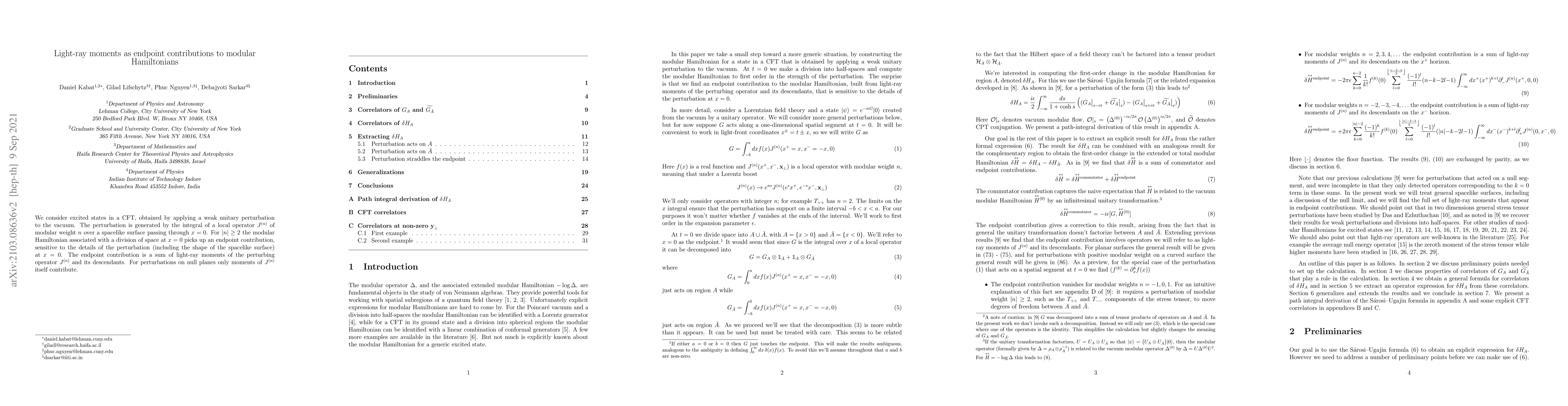 We consider excited states in a CFT, obtained by applying a weak unitary perturbation to the vacuum. The perturbation is generated by the integral of a local operator $J^{(n)}$ of modular weight $n$ over a spacelike surface passing through $x = 0$. For $\vert n \vert \geq 2$ the modular Hamiltonian associated with a division of space at $x = 0$ picks up an endpoint contribution, sensitive to the details of the perturbation (including the shape of the spacelike surface) at $x = 0$. The endpoint contribution is a sum of light-ray moments of the perturbing operator $J^{(n)}$ and its descendants. For perturbations on null planes only moments of $J^{(n)}$ itself contribute.