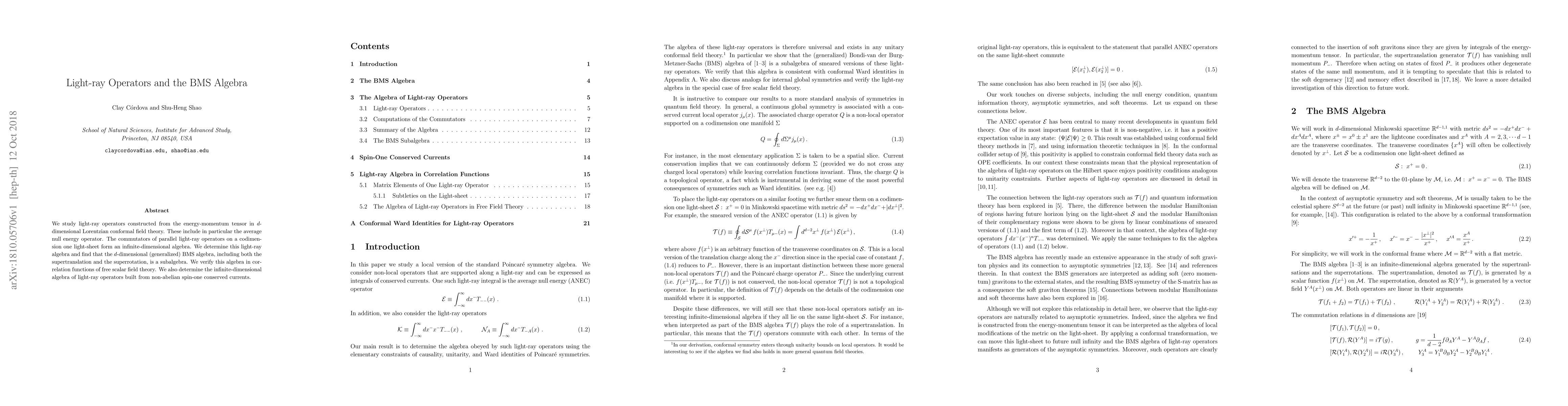 This paper investigates light-ray operators derived from the energy-momentum tensor in $d$-dimensional conformal field theory, revealing an infinite-dimensional algebra formed by their commutators. The study finds that the $d$-dimensional BMS algebra is a subalgebra of this light-ray algebra, verified through correlation functions in free scalar field theory, and extends the findings to non-abelian spin-one conserved currents.