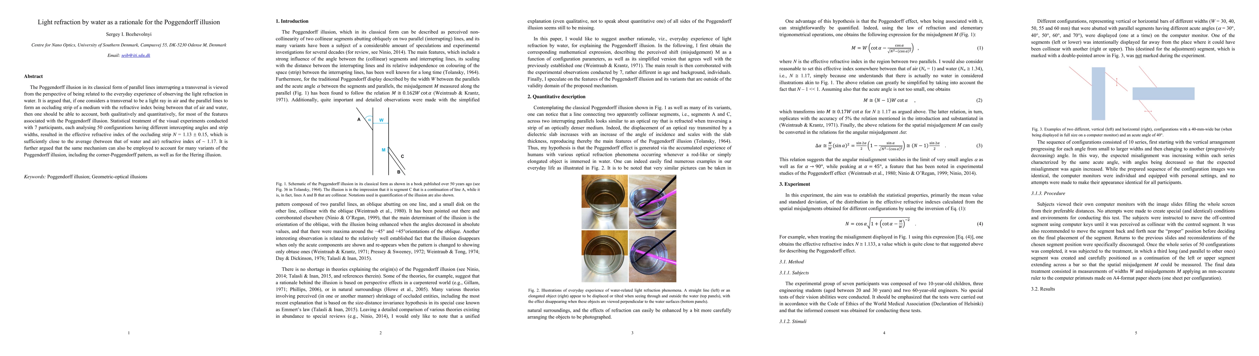 The Poggendorff illusion in its classical form of parallel lines interrupting a transversal is viewed from the perspective of being related to the everyday experience of observing the light refraction in water. It is argued that, if one considers a transversal to be a light ray in air and the parallel lines to form an occluding strip of a medium with the refractive index being between that of air and water, then one should be able to account, both qualitatively and quantitatively, for most of the features associated with the Poggendorff illusion. Statistical treatment of the visual experiments conducted with 7 participants, each analysing 50 configurations having different intercepting angles and strip widths, resulted in the effective refractive index of the occluding strip N = 1.13 +/- 0.15, which is sufficiently close to the average (between that of water and air) refractive index of ~ 1.17. It is further argued that the same mechanism can also be employed to account for many variants of the Poggendorff illusion, including the corner-Poggendorff pattern, as well as for the Hering illusion.