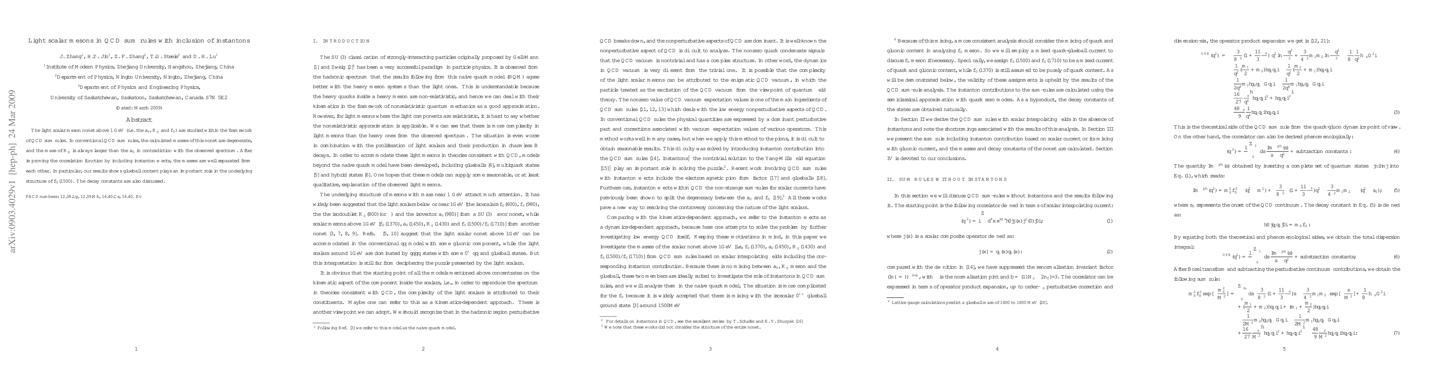This paper studies light scalar mesons in QCD sum rules, addressing the issue of degenerate masses in conventional models. By incorporating instanton effects, the study successfully separates the masses and highlights the glueball content's role in the structure of $f_{0}(1500)$, resolving discrepancies with observed spectra.