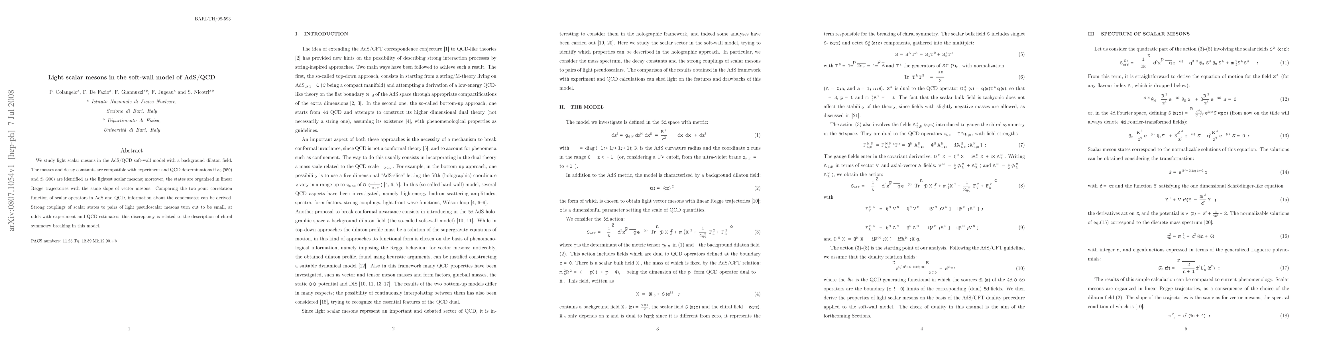This paper investigates light scalar mesons in the AdS/QCD soft-wall model, finding that $a_0(980)$ and $f_0(980)$ align well with experimental data and QCD predictions. However, the model's small couplings to pseudoscalar pairs diverge from experimental observations, indicating issues with chiral symmetry breaking.