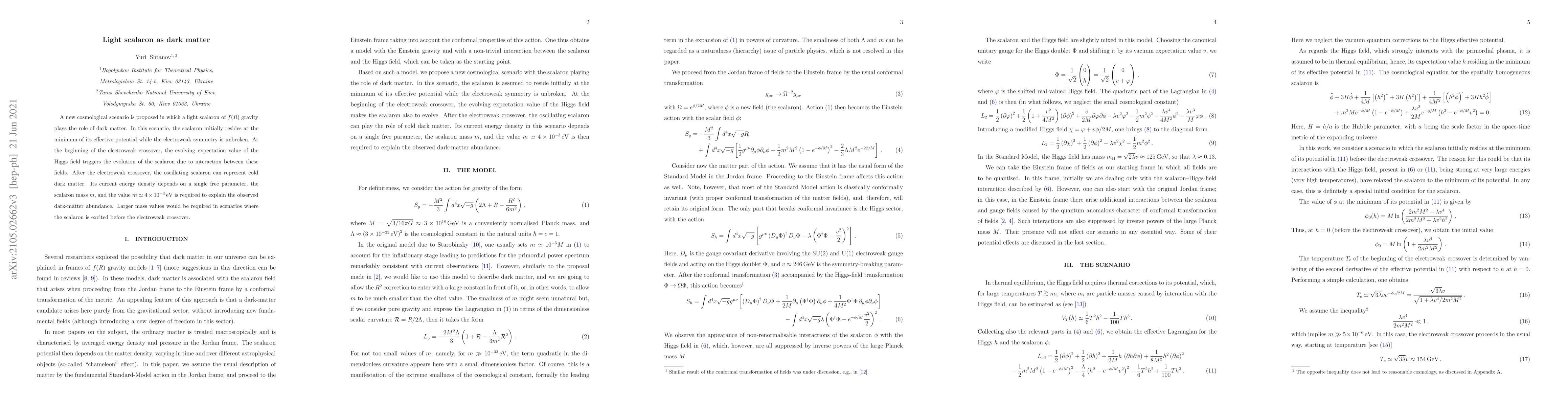 The research proposes a cosmological scenario where a light scalaron from f(R) gravity acts as dark matter, evolving from the minimum of its effective potential during the electroweak symmetry breaking era, triggered by the Higgs field's evolution.