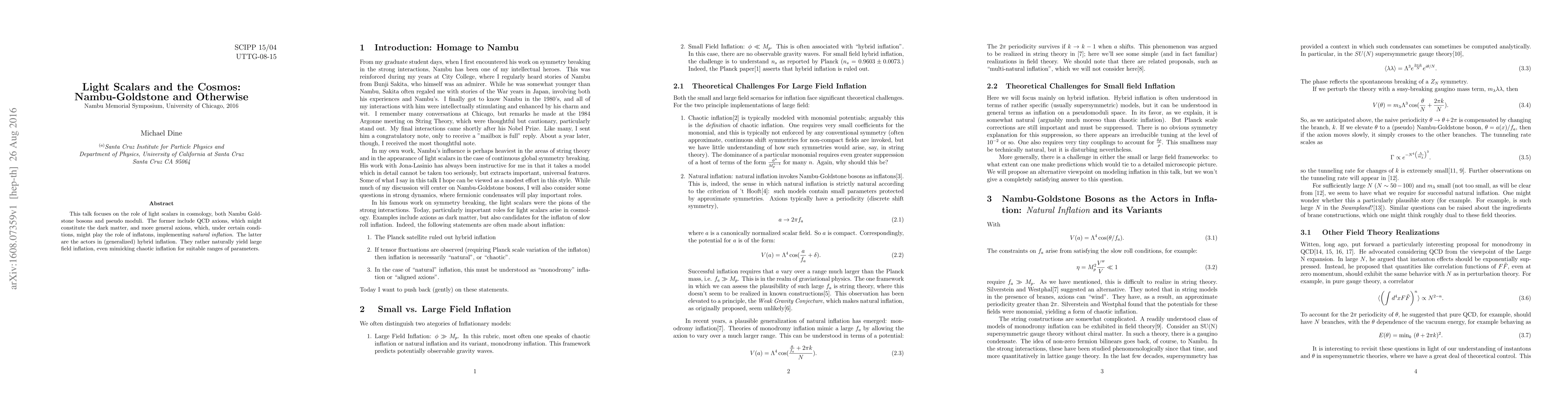 This talk focuses on the role of light scalars in cosmology, both Nambu Goldstone bosons and pseudo moduli. The former include QCD axions, which might constitute the dark matter, and more general axions, which, under certain conditions, might play the role of inflatons, implementing {\it natural inflation}. The latter are the actors in (generalized) hybrid inflation. They rather naturally yield large field inflation, even mimicking chaotic inflation for suitable ranges of parameters.