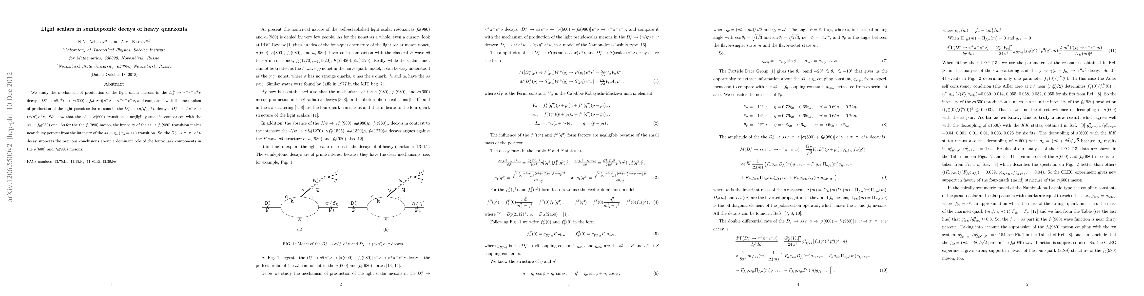 We study the mechanism of production of the light scalar mesons in the $D_s^+\to\pi^+\pi^- e^+\nu$ decays: $D_s^+\to s\bar s e^+\nu\to [\sigma(600)+f_0(980)] e^+\nu\to\pi^+\pi^- e^+\nu$, and compare it with the mechanism of production of the light pseudoscalar mesons in the $D_s^+\to (\eta/\eta') e^+\nu$ decays: $D_s^+\to s\bar s e^+\nu\to (\eta/\eta')e^+\nu$. We show that the $s\bar s\to\sigma(600)$ transition is negligibly small in comparison with the $s\bar s\to f_0(980)$ one. As for the the $f_0(980)$ meson, the intensity of the $s\bar s\to f_0(980)$ transition makes near thirty percent from the intensity of the $s\bar s\to\eta_s$ ($\eta_s=s\bar s$) transition. So, the $D_s^+\to\pi^+\pi^- e^+\nu$ decay supports the previous conclusions about a dominant role of the four-quark components in the $\sigma(600)$ and $f_0(980)$ mesons.