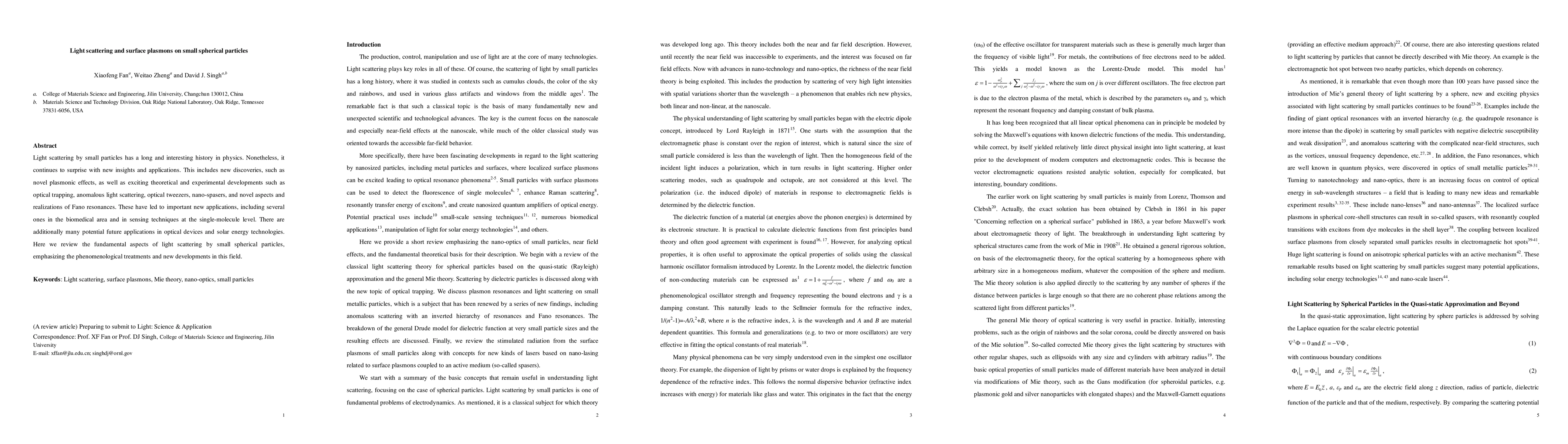 This paper reviews the fundamental aspects of light scattering by small spherical particles, focusing on novel plasmonic effects and recent theoretical and experimental advancements, including applications in biomedicine and sensing at the single-molecule level, with potential future uses in optical devices and solar energy technologies.
