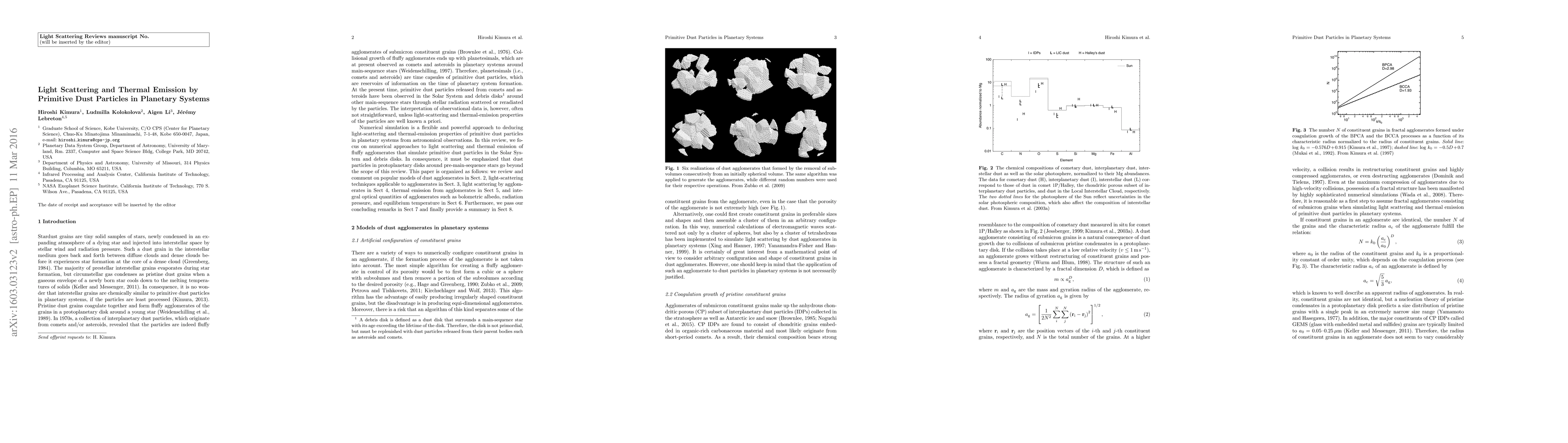 This review focuses on numerical approaches to deducing the light-scattering and thermal-emission properties of primitive dust particles in planetary systems from astronomical observations. The particles are agglomerates of small grains with sizes comparable to visible wavelength and compositions being mainly magnesium-rich silicates, iron-bearing metals, and organic refractory materials in pristine phases. These unique characteristics of primitive dust particles reflect their formation and evolution around main-sequence stars of essentially solar composition. The development of light-scattering theories has been offering powerful tools to make a thorough investigation of light scattering and thermal emission by primitive dust agglomerates in such a circumstellar environment. In particular, the discrete dipole approximation, the T-matrix method, and effective medium approximations are the most popular techniques for practical use in astronomy. Numerical simulations of light scattering and thermal emission by dust agglomerates of submicrometer-sized constituent grains have a great potential to provide new state-of-the-art knowledge of primitive dust particles in planetary systems. What is essential to this end is to combine the simulations with comprehensive collections of relevant results from not only astronomical observations, but also in-situ data analyses, laboratory sample analyses, laboratory analogue experiments, and theoretical studies on the origin and evolution of the particles.