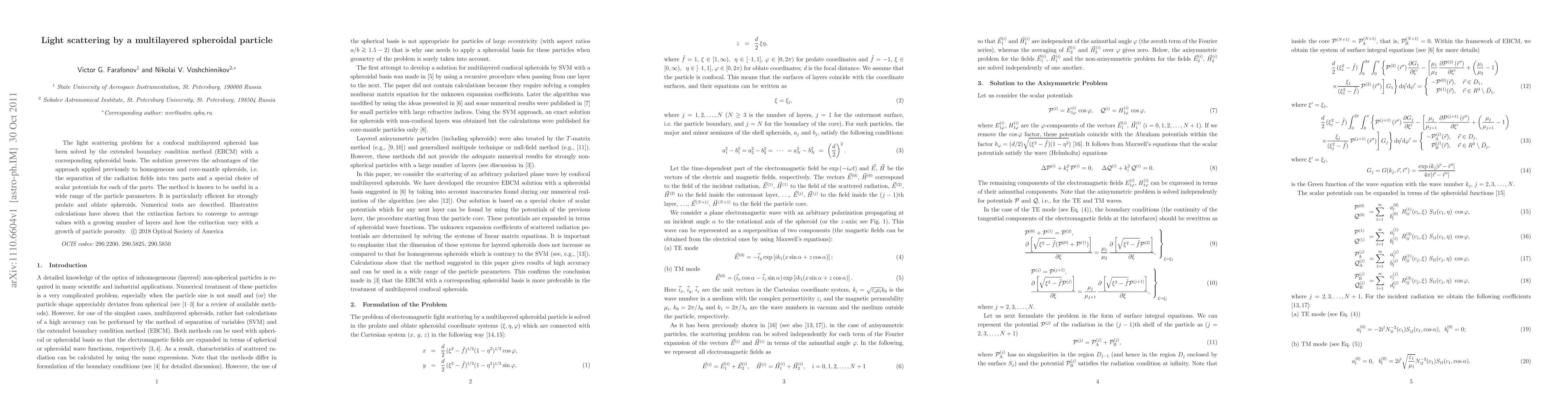 The light scattering problem for a confocal multilayered spheroid has been solved by the extended boundary condition method (EBCM) with a corresponding spheroidal basis. The solution preserves the advantages of the approach applied previously to homogeneous and core-mantle spheroids, i.e. the separation of the radiation fields into two parts and a special choice of scalar potentials for each of the parts. The method is known to be useful in a wide range of the particle parameters. It is particularly efficient for strongly prolate and oblate spheroids. Numerical tests are described. Illustrative calculations have shown that the extinction factors to converge to average values with a growing number of layers and how the extinction vary with a growth of particle porosity.