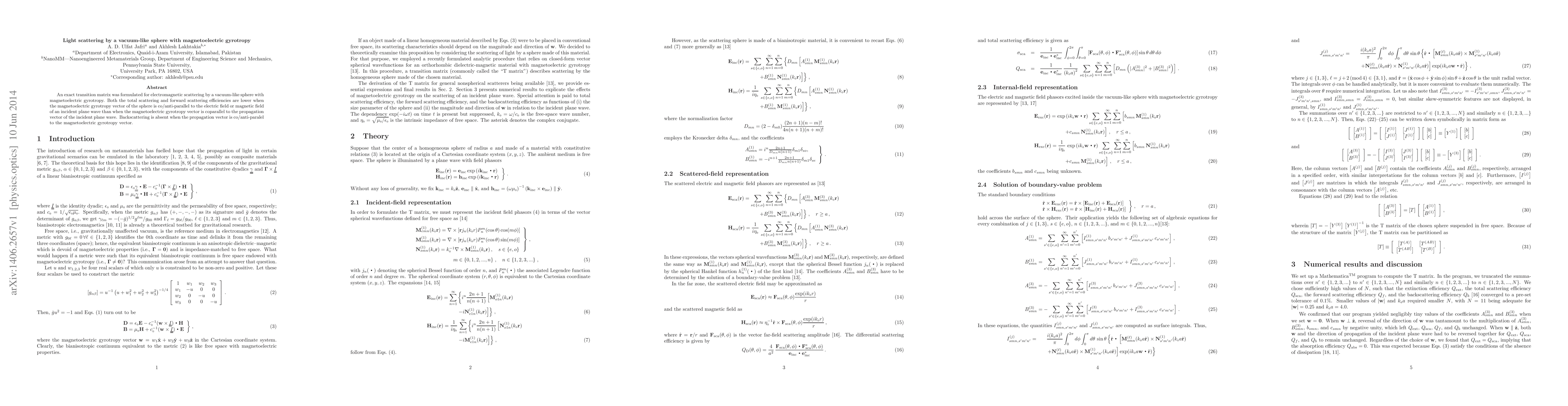 An exact transition matrix was formulated for electromagnetic scattering by a vacuum-like sphere with magnetoelectric gyrotropy. Both the total scattering and forward scattering efficiencies are lower when the magnetoelectric gyrotropy vector of the sphere is co/anti-parallel to the electric field or magnetic field of an incident plane wave than when the magnetoelectric gyrotropy vector is coparallel to the propagation vector of the incident plane wave. Backscattering is absent when the propagation vector is co/anti-paralel to the magnetoelectric gyrotropy vector.