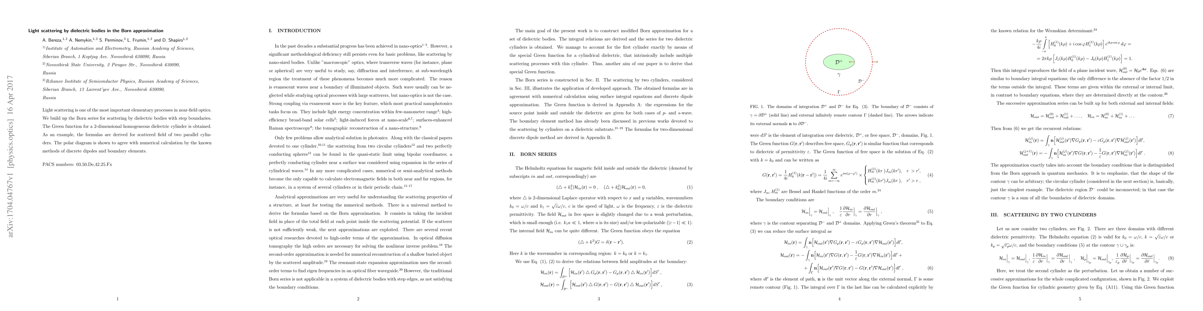Light scattering is one of the most important elementary processes in near-field optics. We build up the Born series for scattering by dielectric bodies with step boundaries. The Green function for a 2-dimensional homogeneous dielectric cylinder is obtained. As an example, the formulas are derived for scattered field of two parallel cylinders. The polar diagram is shown to agree with numerical calculation by the known methods of discrete dipoles and boundary elements.