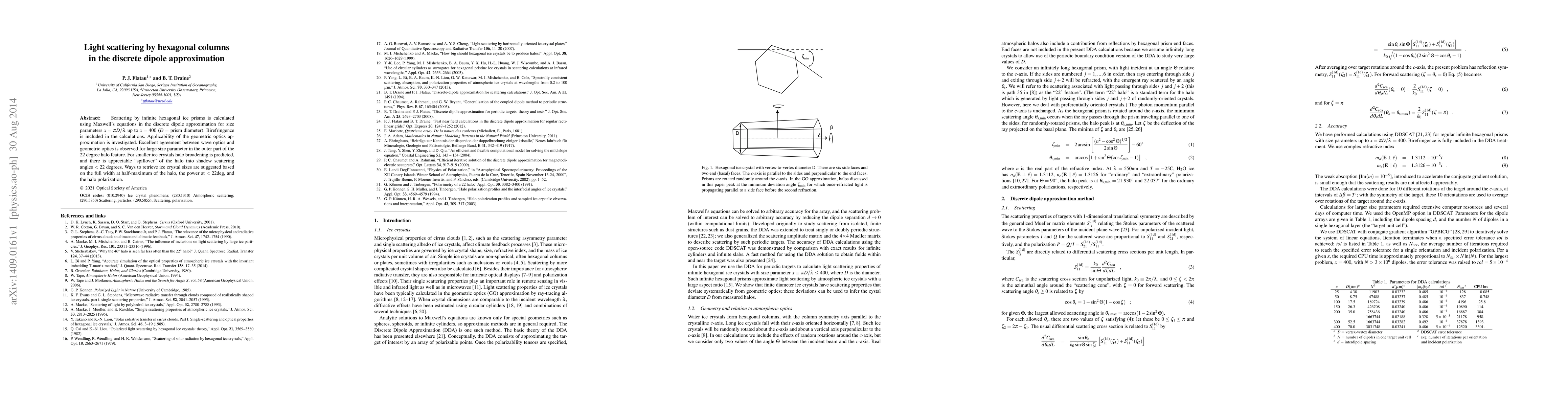 Researchers used a mathematical model to study how light scatters off hexagonal ice crystals, finding good agreement between wave optics and geometric optics for large crystals, but predicting broader halos and 'spillover' scattering for smaller crystals.