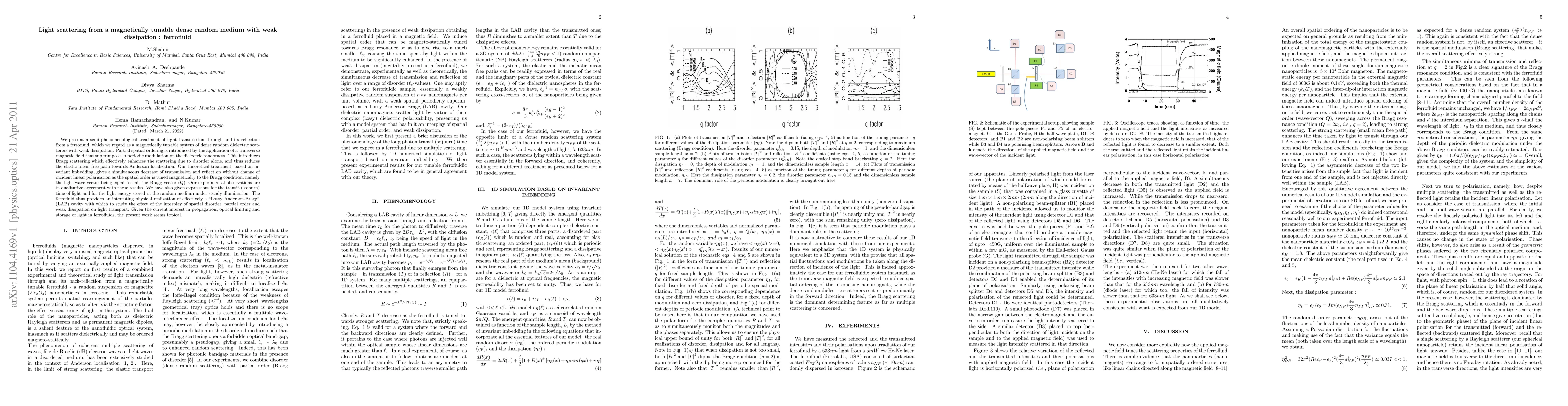 We present a semi-phenomenological treatment of light transmission through and its reflection from a ferrofluid, which we regard as a magnetically tunable system of dense random dielectric scatterers with weak dissipation. Partial spatial ordering is introduced by the application of a transverse magnetic field that superimposes a periodic modulation on the dielectric randomess. This introduces Bragg scattering which effectively enhances the scattering due to disorder alone, and thus reduces the elastic mean free path towards Anderson localization. Our theoretical treatment, based on invariant imbedding, gives a simultaneous decrease of transmission and reflection without change of incident linear polarisation as the spatial order is tuned magnetically to the Bragg condition, namely the light wave vector being equal to half the Bragg vector (Q). Our experimental observations are in qualitative agreement with these results. We have also given expressions for the transit (sojourn) time of light and for the light energy stored in the random medium under steady illumination. The ferrofluid thus provides an interesting physical realization of effectively a "Lossy Anderson-Bragg" (LAB) cavity with which to study the effect of the interplay of spatial disorder, partial order and weak dissipation on light transport. Given the current interest in propagation, optical limiting and storage of light in ferrofluids, the present work seems topical.
