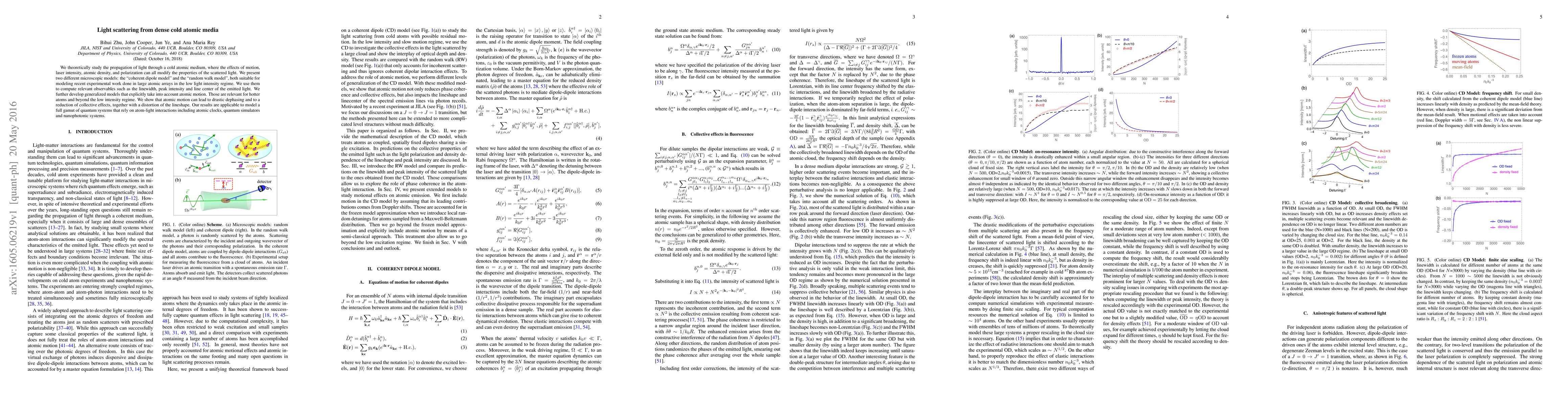 This paper theoretically investigates light scattering in dense cold atomic media, employing two microscopic models to analyze how motion, laser intensity, atomic density, and polarization affect the scattered light properties. It highlights the impact of atomic motion on dephasing and collective effects, with implications for quantum systems like atomic clocks and quantum simulators.