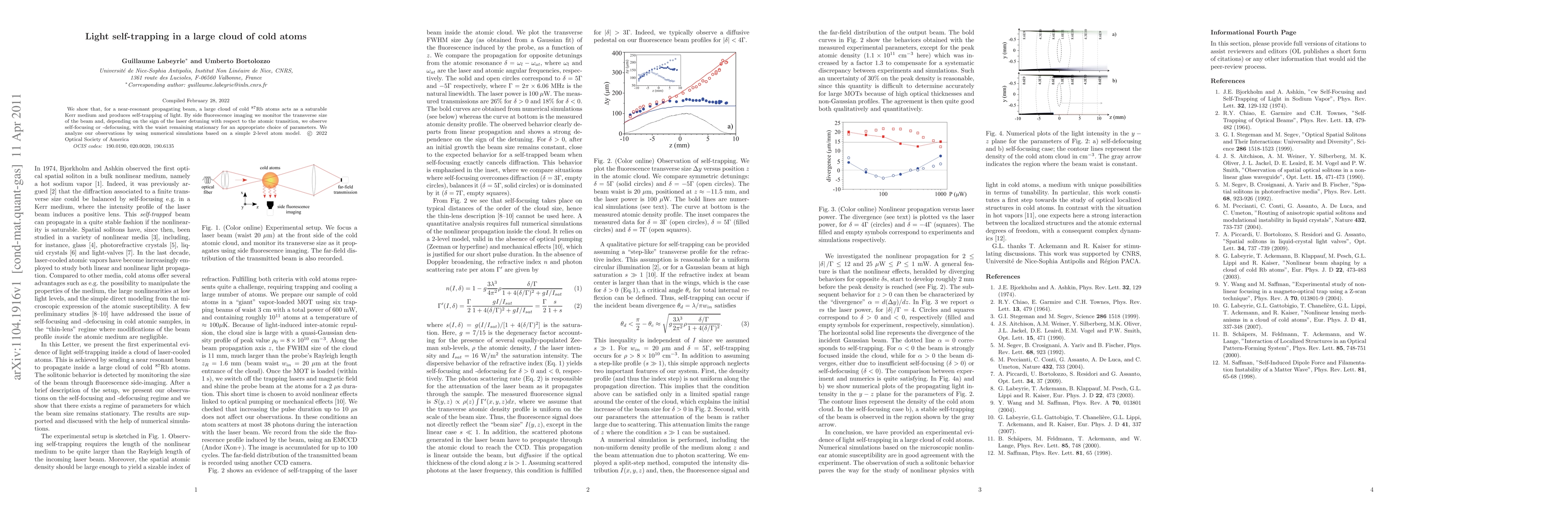 This paper demonstrates light self-trapping in a cloud of cold 87Rb atoms, showing that the cloud behaves as a saturable Kerr medium. Depending on laser detuning, the beam either self-focuses or defocuses, with the waist remaining stationary, as observed via side fluorescence imaging and confirmed by numerical simulations.