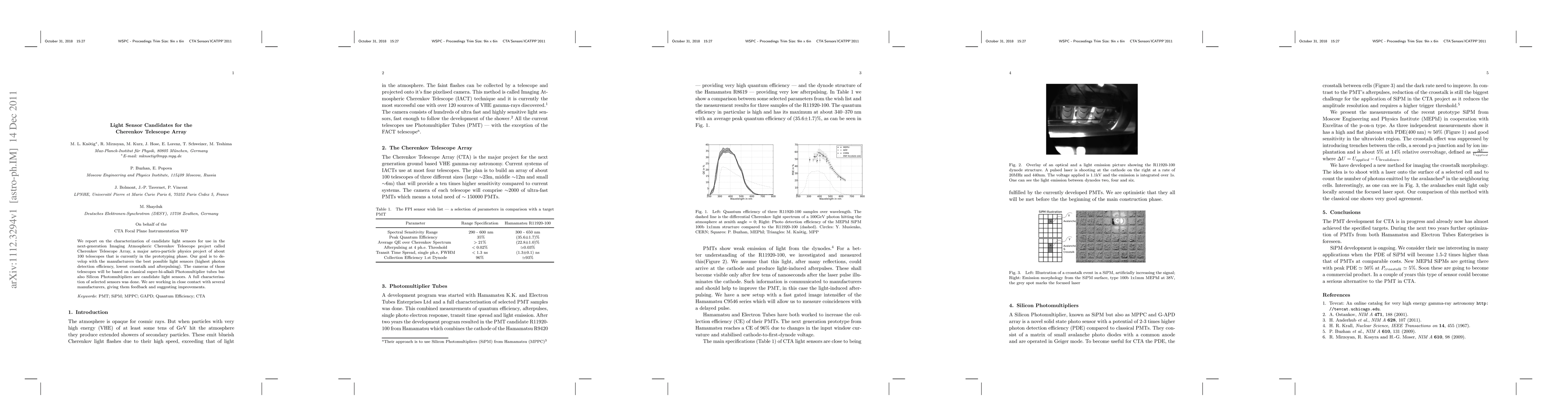We report on the characterization of candidate light sensors for use in the next-generation Imaging Atmospheric Cherenkov Telescope project called Cherenkov Telescope Array, a major astro-particle physics project of about 100 telescopes that is currently in the prototyping phase. Our goal is to develop with the manufacturers the best possible light sensors (highest photon detection efficiency, lowest crosstalk and afterpulsing). The cameras of those telescopes will be based on classical super-bi-alkali Photomultiplier tubes but also Silicon Photomultipliers are candidate light sensors. A full characterisation of selected sensors was done. We are working in close contact with several manufacturers, giving them feedback and suggesting improvements.