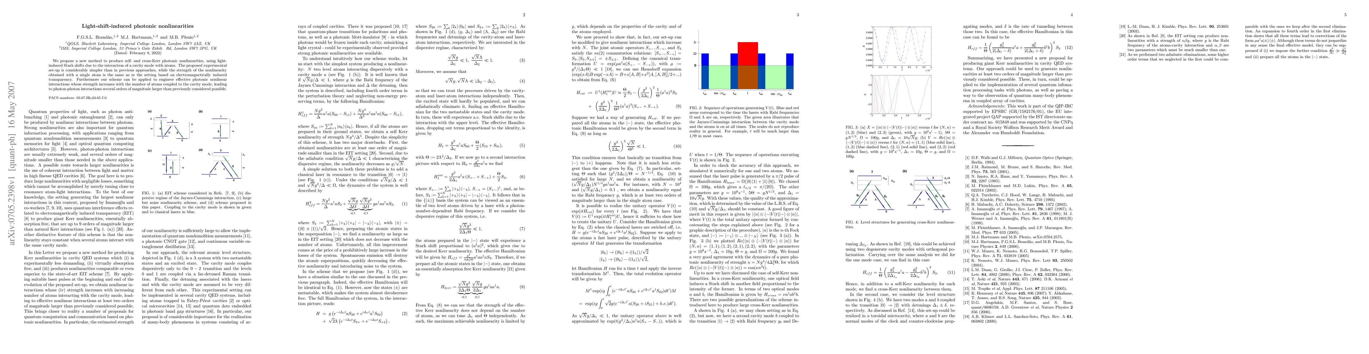 This paper proposes a simplified method to achieve self- and cross-Kerr photonic nonlinearities via light-induced Stark shifts from cavity-atom interactions, comparable to previous methods based on electromagnetically induced transparency. The scheme allows for scalable enhancement of photon-photon interactions with multiple atoms.