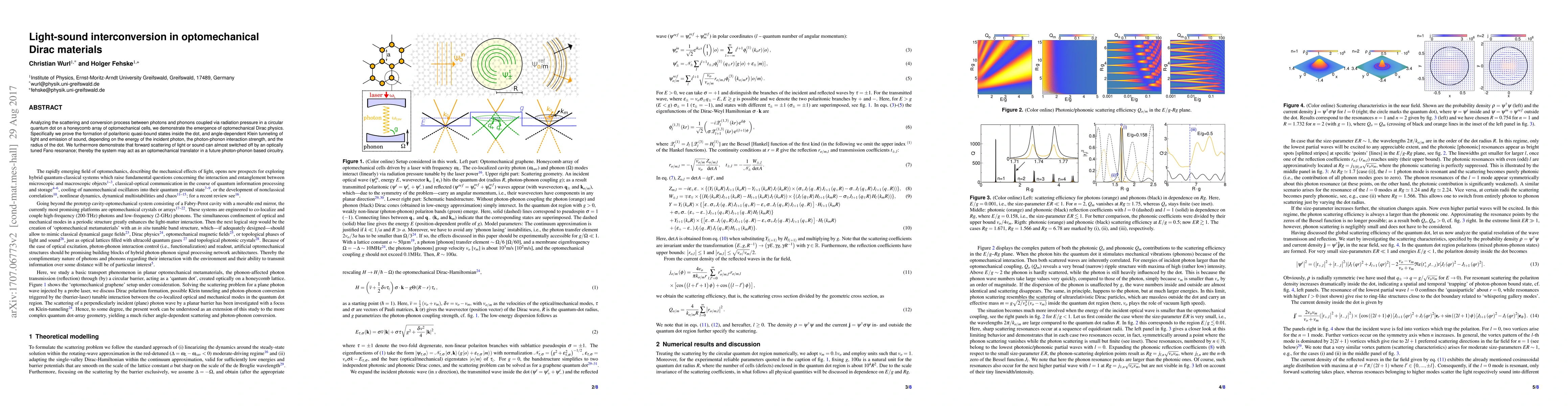 Analyzing the scattering and conversion process between photons and phonons coupled via radiation pressure in a circular quantum dot on a honeycomb array of optomechanical cells, we demonstrate the emergence of optomechanical Dirac physics. Specifically we prove the formation of polaritonic quasi-bound states inside the dot, and angle-dependent Klein tunneling of light and emission of sound, depending on the energy of the incident photon, the photon-phonon interaction strength, and the radius of the dot. We furthermore demonstrate that forward scattering of light or sound can almost switched off by an optically tuned Fano resonance; thereby the system may act as an optomechanical translator in a future photon-phonon based circuitry.
