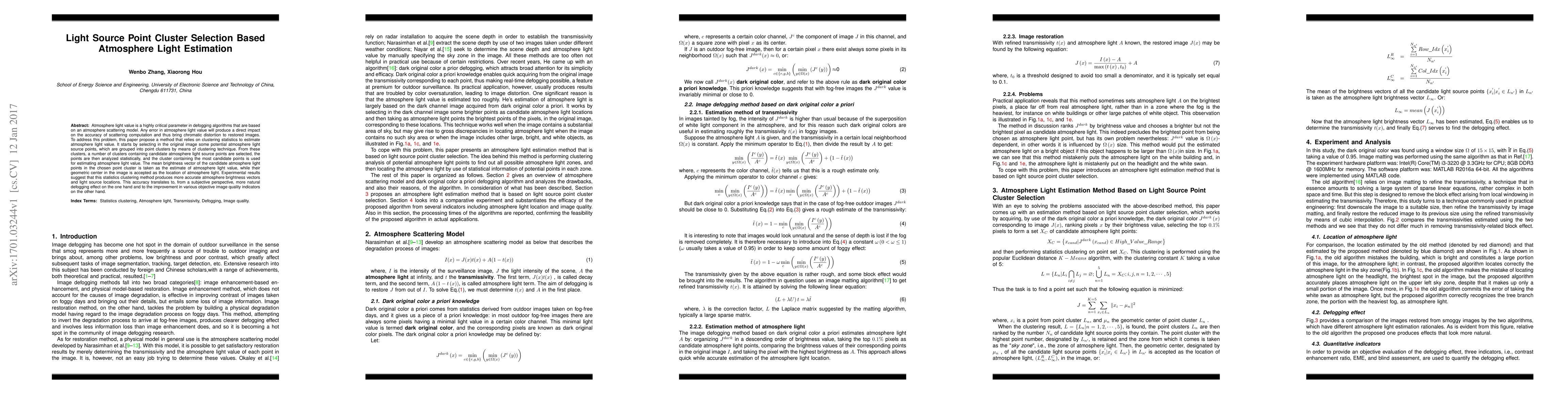 A new method uses clustering statistics to estimate atmosphere light value in images, improving defogging accuracy and image quality indicators.