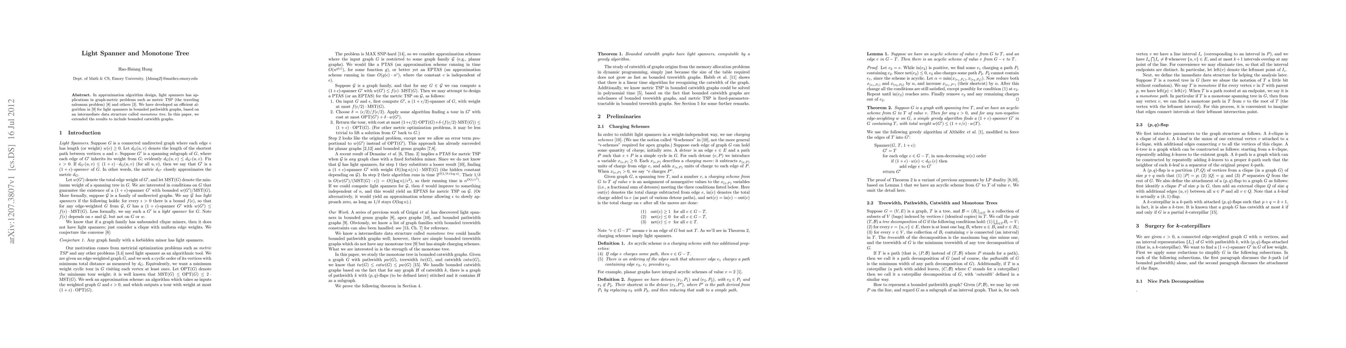 This paper presents an efficient algorithm for constructing light spanners in bounded pathwidth graphs using a monotone tree data structure, and extends these results to also cover bounded catwidth graphs, aiding in solving graph-metric problems like metric TSP.