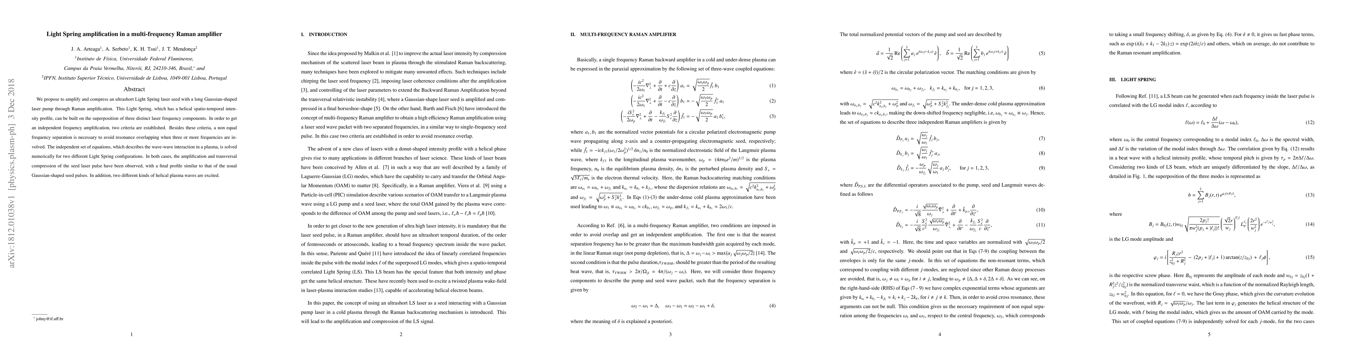 We propose to amplify and compress an ultrashort Light Spring laser seed with a long Gaussian-shaped laser pump through Raman amplification. This Light Spring, which has a helical spatio-temporal intensity profile, can be built on the superposition of three distinct laser frequency components. In order to get an independent frequency amplification, two criteria are established. Besides these criteria, a non equal frequency separation is necessary to avoid resonance overlapping when three or more frequencies are involved. The independent set of equations, which describes the wave-wave interaction in a plasma, is solved numerically for two different Light Spring configurations. In both cases, the amplification and transversal compression of the seed laser pulse have been observed, with a final profile similar to that of the usual Gaussian-shaped seed pulses. In addition, two different kinds of helical plasma waves are excited.