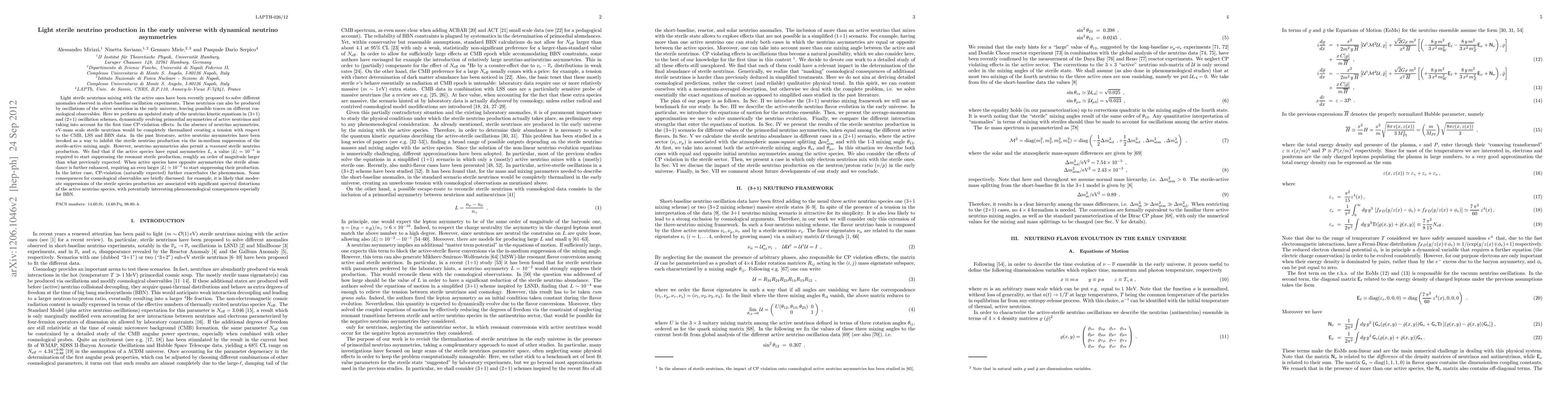 This paper investigates the production of light sterile neutrinos in the early universe, considering the dynamical evolution of active neutrino asymmetries and CP-violation effects. It finds that significant asymmetries are required to suppress resonant sterile neutrino production, with larger asymmetries needed when asymmetries are opposite among active species, and CP-violation further enhancing the effect.
