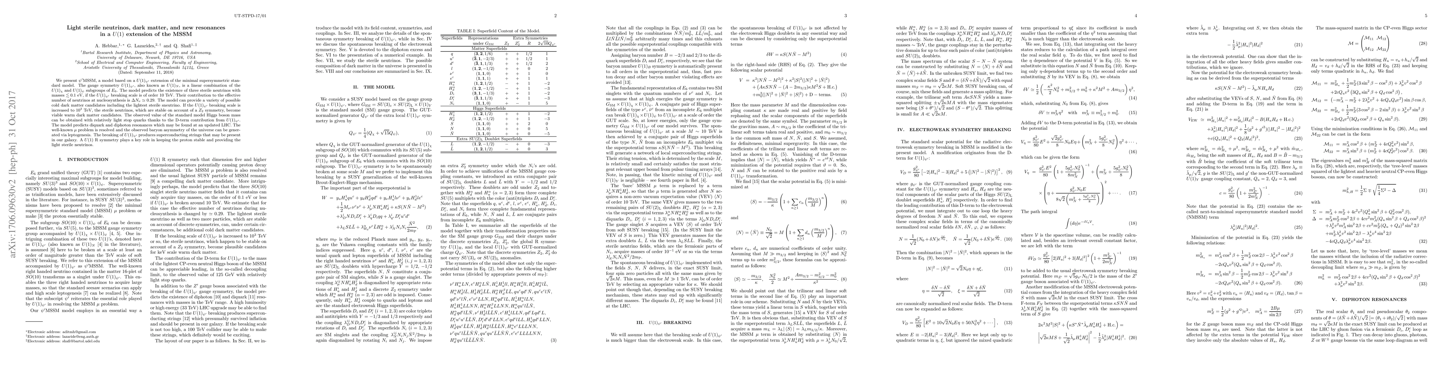 We present $\psi'$MSSM, a model based on a $U(1)_{\psi'}$ extension of the minimal supersymmetric standard model. The gauge symmetry $U(1)_{\psi'}$, also known as $U(1)_N$, is a linear combination of the $U(1)_\chi$ and $U(1)_\psi$ subgroups of $E_6$. The model predicts the existence of three sterile neutrinos with masses $\lesssim 0.1~{\rm eV}$, if the $U(1)_{\psi'}$ breaking scale is of order 10 TeV. Their contribution to the effective number of neutrinos at nucleosynthesis is $\Delta N_{\nu}\simeq 0.29$. The model can provide a variety of possible cold dark matter candidates including the lightest sterile sneutrino. If the $U(1)_{\psi'}$ breaking scale is increased to $10^3~{\rm TeV}$, the sterile neutrinos, which are stable on account of a $Z_2$ symmetry, become viable warm dark matter candidates. The observed value of the standard model Higgs boson mass can be obtained with relatively light stop quarks thanks to the D-term contribution from $U(1)_{\psi'}$. The model predicts diquark and diphoton resonances which may be found at an updated LHC. The well-known $\mu$ problem is resolved and the observed baryon asymmetry of the universe can be generated via leptogenesis. The breaking of $U(1)_{\psi'}$ produces superconducting strings that may be present in our galaxy. A $U(1)$ R symmetry plays a key role in keeping the proton stable and providing the light sterile neutrinos.