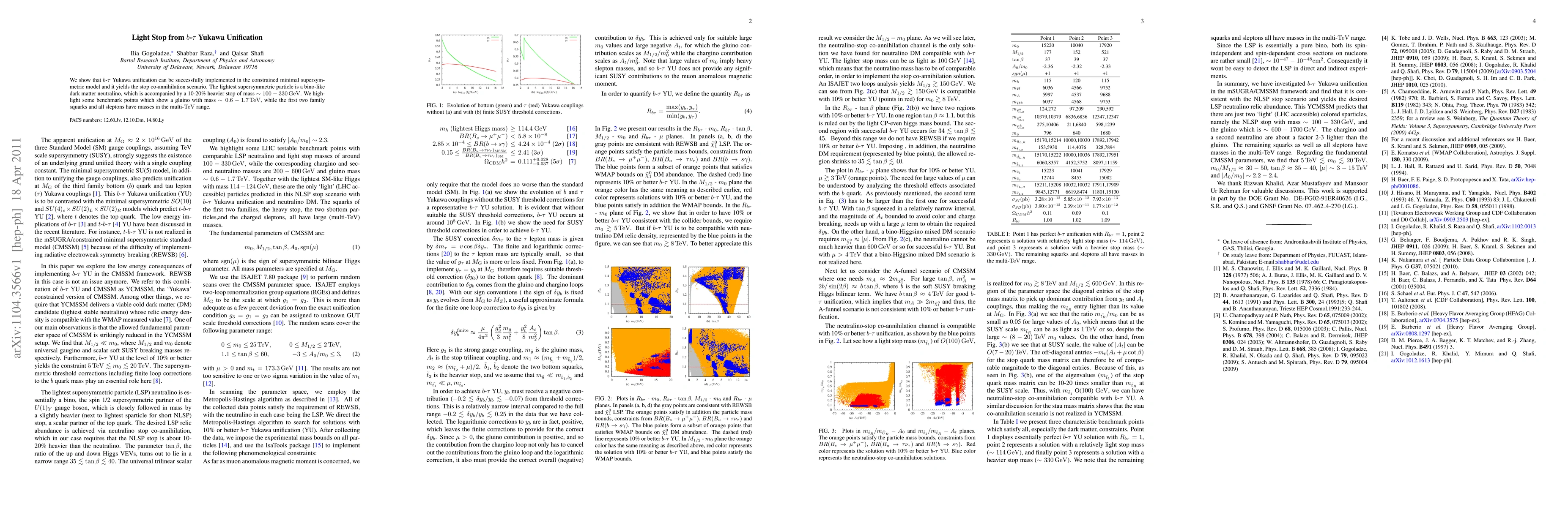This paper demonstrates that b-tau Yukawa unification in the constrained minimal supersymmetric model leads to a stop co-annihilation scenario, with a bino-like neutralino as the lightest supersymmetric particle and a stop mass of ~100-330 GeV. Benchmark points also feature gluinos with masses around 0.6-1.7 TeV and heavier squarks and sleptons in the multi-TeV range.