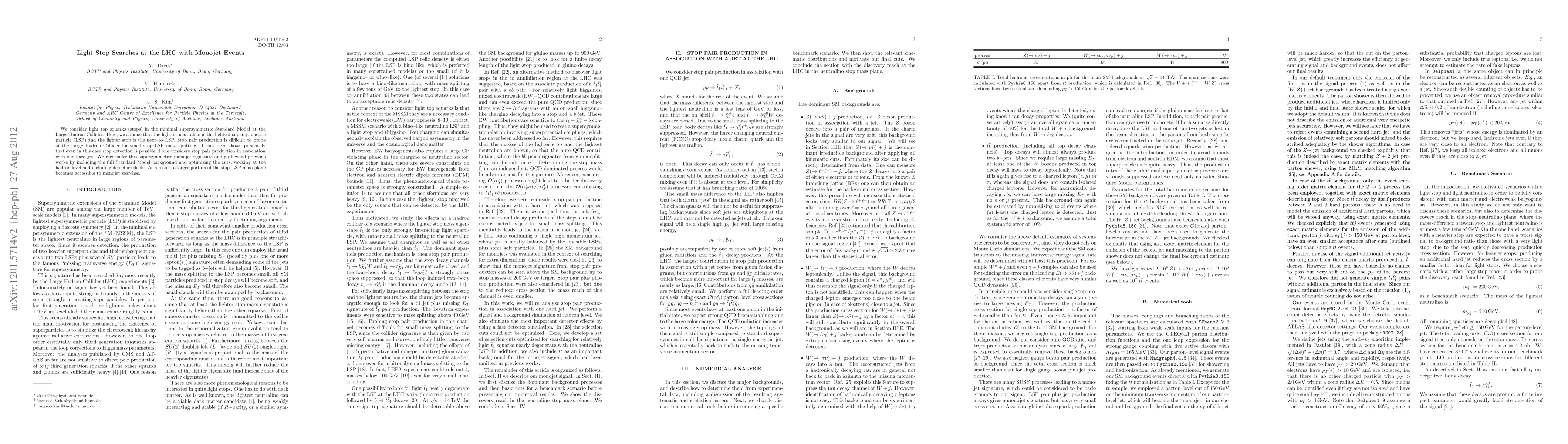 We consider light top squarks (stops) in the minimal supersymmetric Standard Model at the Large Hadron Collider. Here, we assume that the lightest neutralino is the lightest supersymmetric particle (LSP) and the lighter stop is the next-to-LSP. Stop pair production is difficult to probe at the Large Hadron Collider for small stop-LSP mass splitting. It has been shown previously that even in this case stop detection is possible if one considers stop pair production in association with one hard jet. We reconsider this supersymmetric monojet signature and go beyond previous works by including the full Standard Model background and optimizing the cuts, working at the hadron level and including detector effects. As a result, a larger portion of the stop-LSP mass plane becomes accessible to monojet searches.