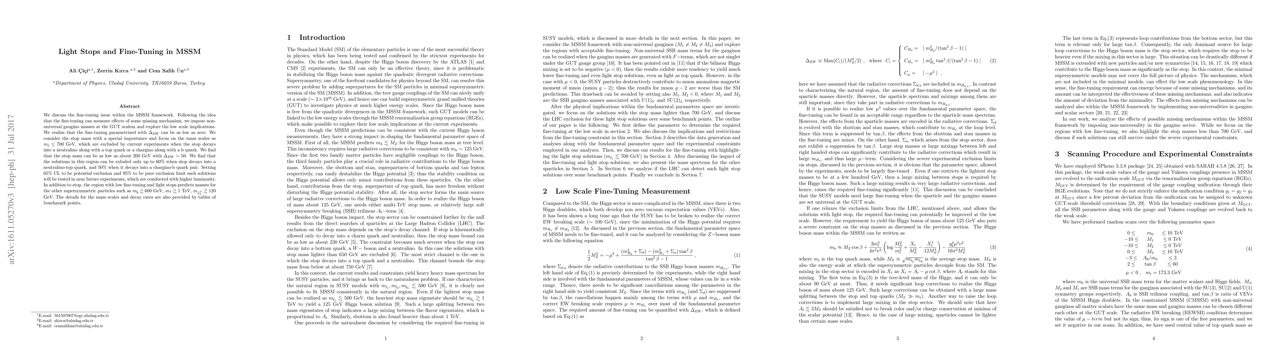 We discuss the fine-tuning issue within the MSSM framework. Following the idea that the fine-tuning can measure effects of some missing mechanism, we impose non-universal gaugino masses at the GUT scalem and explore the low scale implications. We realize that the fine-tuning parametrized with Delta_EW can be as low as zero. We consider the stop mass with a special importance and focus on the mass scales as m_stop <=700 GeV, which are excluded by current experiments when the stop decays into a neutralino along with a top quark or a chargino along with a b quark. We find that the stop mass can be as low as about 200 GeV with Delta_EW ~ 50. We find that the solutions in this region can be exluded only up to 60% when stop decays into a neutralino-top quark, and 50% when it decays into a chargino-b quark pair. Setting 65% CL to be potential exclusion and 95% to be pure exclusion limit such solutions will be tested in near future experiments, which are conducted with higher luminosity. In addition to stop, the region with low fine-tuning and light stops predicts masses for the other supersymmetric particles such as m_sbottom >~ 600 GeV, m_stau >~ 1 TeV, m_chargino >~ 120 GeV. The details for the mass scales and decay rates are also provided by tables of benchmark points.