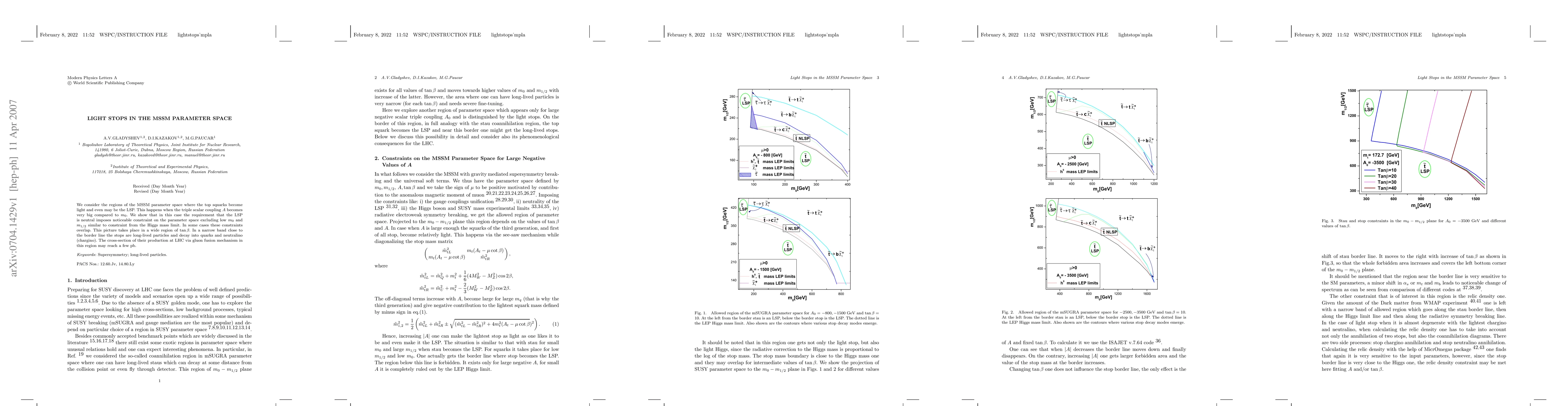 This paper explores the MSSM parameter space where top squarks (stops) become light and potentially the lightest supersymmetric particle (LSP). It finds that large triple scalar coupling A relative to m_0 imposes significant constraints, excluding low m_0 and m_{1/2} similar to Higgs mass limits, with some overlaps. Stops in a narrow band near the boundary are long-lived and decay into quarks and neutralino/chargino, with a production cross-section of a few pb at the LHC.
