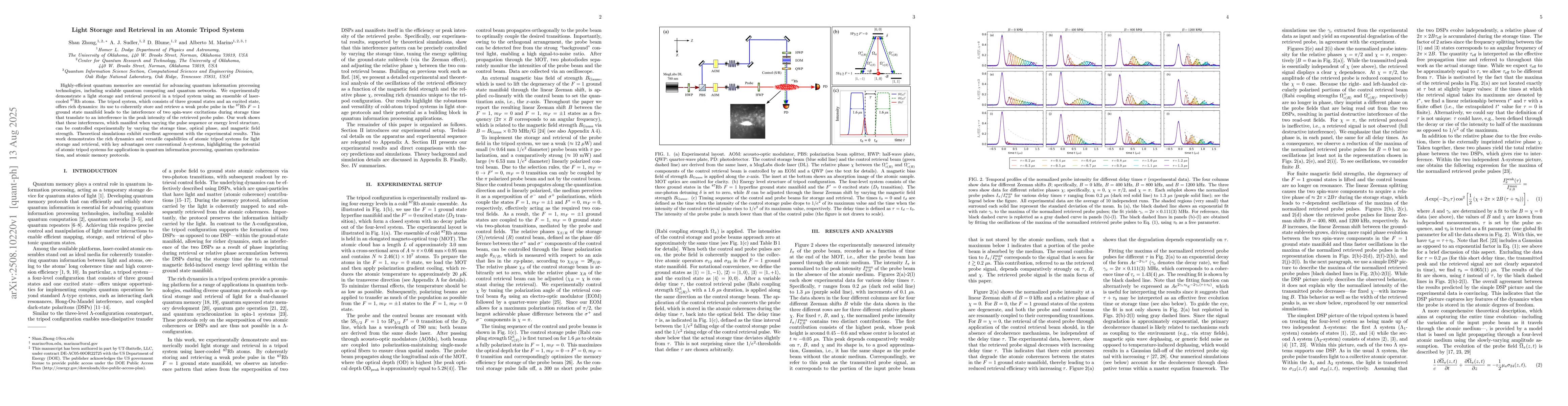 Highly-efficient quantum memories are essential for advancing quantum information processing technologies, including scalable quantum computing and quantum networks. We experimentally demonstrate a light storage and retrieval protocol in a tripod system using an ensemble of laser-cooled $^{87}$Rb atoms. The tripod system, which consists of three ground states and an excited state, offers rich dynamics: its use to coherently store and retrieve a weak probe pulse in the $^{87}$Rb $F=1$ ground state manifold leads to the interference of two spin-wave excitations during storage time that translate to an interference in the peak intensity of the retrieved probe pulse. Our work shows that these interferences, which manifest when varying the pulse sequence or energy level structure, can be controlled experimentally by varying the storage time, optical phase, and magnetic field strength. Theoretical simulations exhibit excellent agreement with the experimental results. This work demonstrates the rich dynamics and versatile capabilities of atomic tripod systems for light storage and retrieval, with key advantages over conventional $\Lambda$-systems, highlighting the potential of atomic tripod systems for applications in quantum information processing, quantum synchronization, and atomic memory protocols.