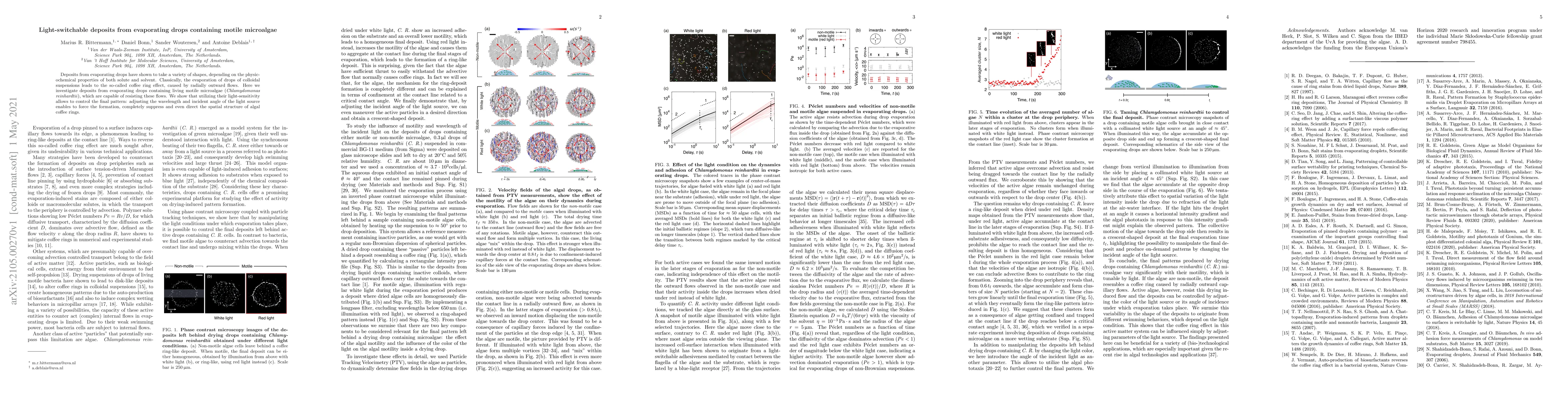 This study explores how evaporating drops containing motile microalgae form deposits, leveraging their light-sensitivity to control the resulting pattern. By adjusting light wavelength and angle, researchers can manipulate the spatial structure of the algal deposits, bypassing typical coffee ring effects.