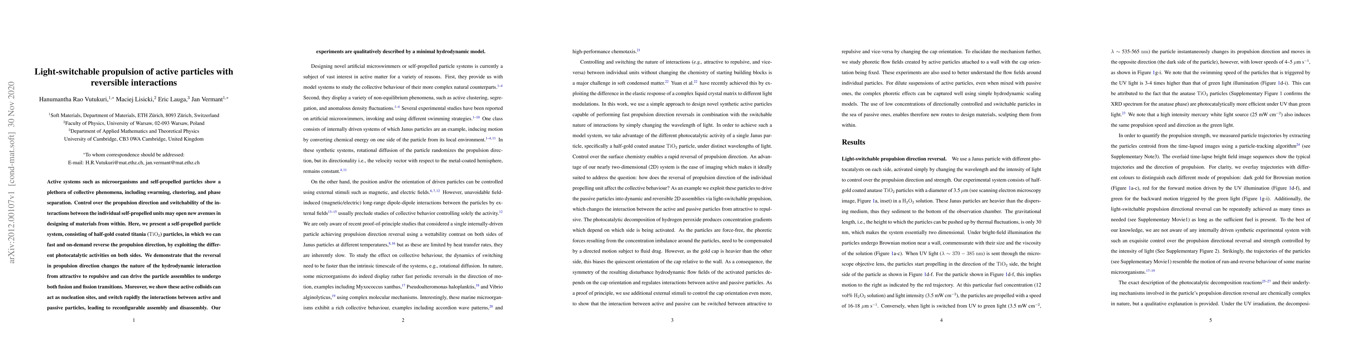 This paper presents a system of self-propelled particles coated with half-gold and half-titania that can reverse their propulsion direction on-demand via photocatalytic activity, altering their hydrodynamic interactions from attractive to repulsive and enabling reconfigurable assembly and disassembly. The findings are supported by a minimal hydrodynamic model.