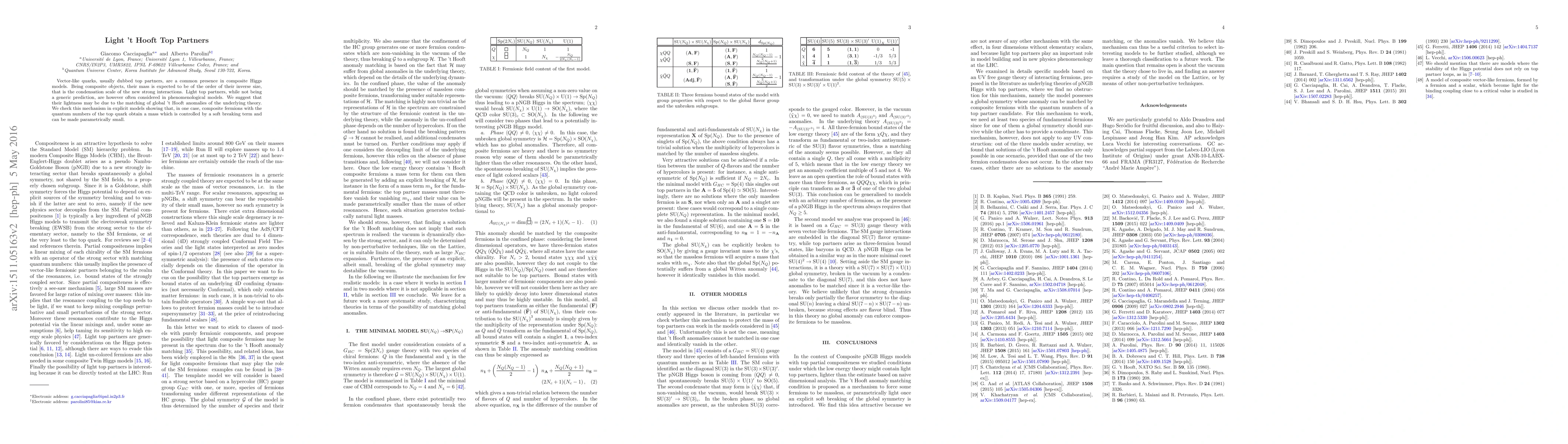 This paper explores the possibility of light top partners in composite Higgs models, suggesting that their reduced mass may result from the matching of global 't Hooft anomalies. The authors demonstrate this mechanism in explicit models, showing that composite fermions with top quark quantum numbers can achieve a small mass controlled by a soft breaking term.