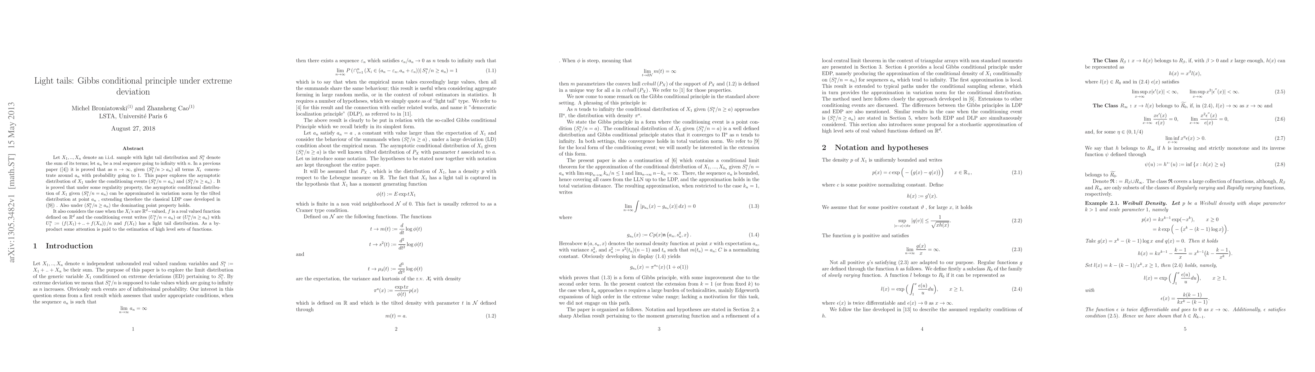 Let $X_{1},..,X_{n}$ denote an i.i.d. sample with light tail distribution and $S_{1}^{n}$ denote the sum of its terms; let $a_{n}$ be a real sequence\ going to infinity with $n.$\ In a previous paper (\cite{BoniaCao}) it is proved that as $n\rightarrow\infty$, given $\left(S_{1}^{n}/n>a_{n}\right) $ all terms $X_{i_{\text{}}}$ concentrate around $a_{n}$ with probability going to 1. This paper explores the asymptotic distribution of $X_{1}$ under the conditioning events $\left(S_{1}^{n}/n=a_{n}\right) $ and $\left(S_{1}^{n}/n\geq a_{n}\right)$ . It is proved that under some regulatity property, the asymptotic conditional distribution of $X_{1}$ given $\left(S_{1}^{n}/n=a_{n}\right) $ can be approximated in variation norm by the tilted distribution at point $a_{n}$, extending therefore the classical LDP case developed in Diaconis and Freedman (1988) . Also under $\left(S_{1}^{n}/n\geq a_{n}\right) $ the dominating point property holds. It also considers the case when the $X_{i}$'s are $\mathbb{R}^{d}-$valued, $f$ is a real valued function defined on $\mathbb{R}^{d}$ and the conditioning event writes $\left(U_{1}^{n}/n=a_{n}\right) $ or $\left(U_{1}^{n}/n\geq a_{n}\right)$ with $U_{1}^{n}:=\left(f(X_{1})+..+f(X_{n})\right) /n$ and $f(X_{1})$ has a light tail distribution$.$ As a by-product some attention is paid to the estimation of high level sets of functions.