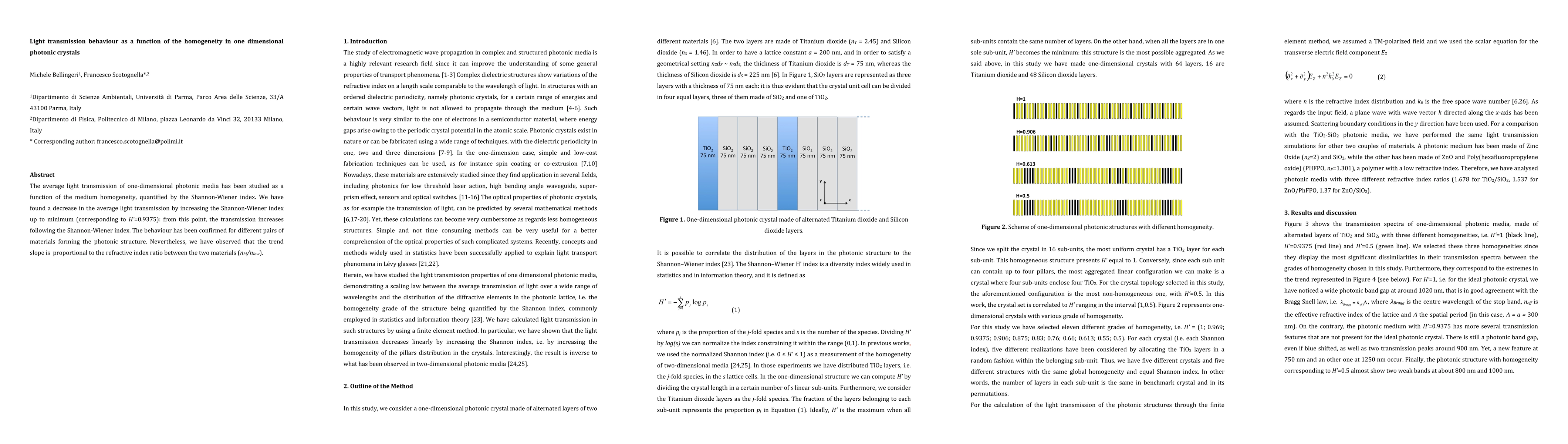 Summary: This study investigates the relationship between light transmission in one-dimensional photonic crystals and their homogeneity, measured by the Shannon-Wiener index. The research finds that light transmission decreases with increasing homogeneity up to a minimum, after which it rises again, with the trend's slope proportional to the refractive index ratio of the materials used.