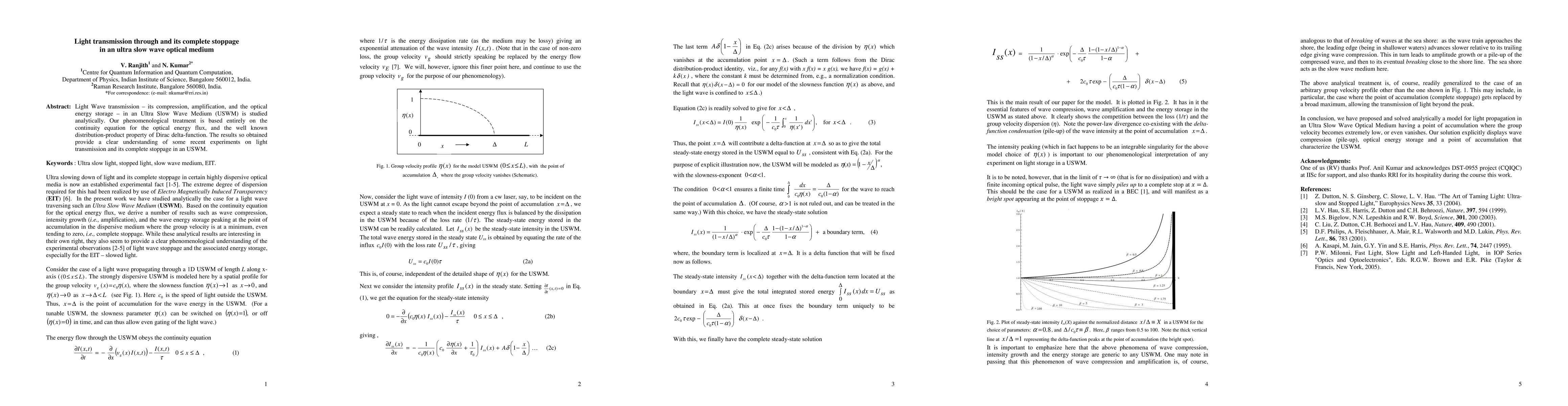 Light Wave transmission -- its compression, amplification, and the optical energy storage -- in an Ultra Slow Wave Medium (USWM) is studied analytically. Our phenomenological treatment is based entirely on the continuity equation for the optical energy flux, and the well known distribution-product property of Dirac delta-function. The results so obtained provide a clear understanding of some recent experiments on light transmission and its complete stoppage in an USWM. Keywords : Ultra slow light, stopped light, slow wave medium, EIT.