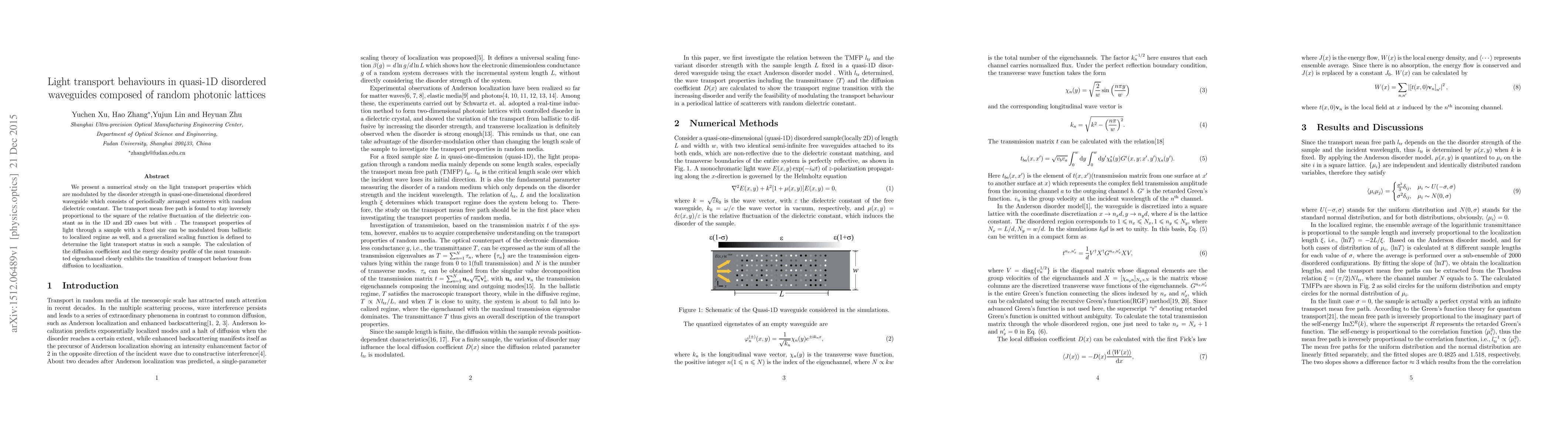 We present a numerical study on the light transport properties which are modulated by the disorder strength in quasi-one-dimensional disordered waveguide which consists of periodically arranged scatterers with random dielectric constant. The transport mean free path is found to stay inversely proportional to the square of the relative fluctuation of the dielectric constant as in the 1D and 2D cases but with . The transport properties of light through a sample with a fixed size can be modulated from ballistic to localized regime as well, and a generalized scaling function is defined to determine the light transport status in such a sample. The calculation of the diffusion coefficient and the energy density profile of the most transmitted eigenchannel clearly exhibits the transition of transport behaviour from diffusion to localization.