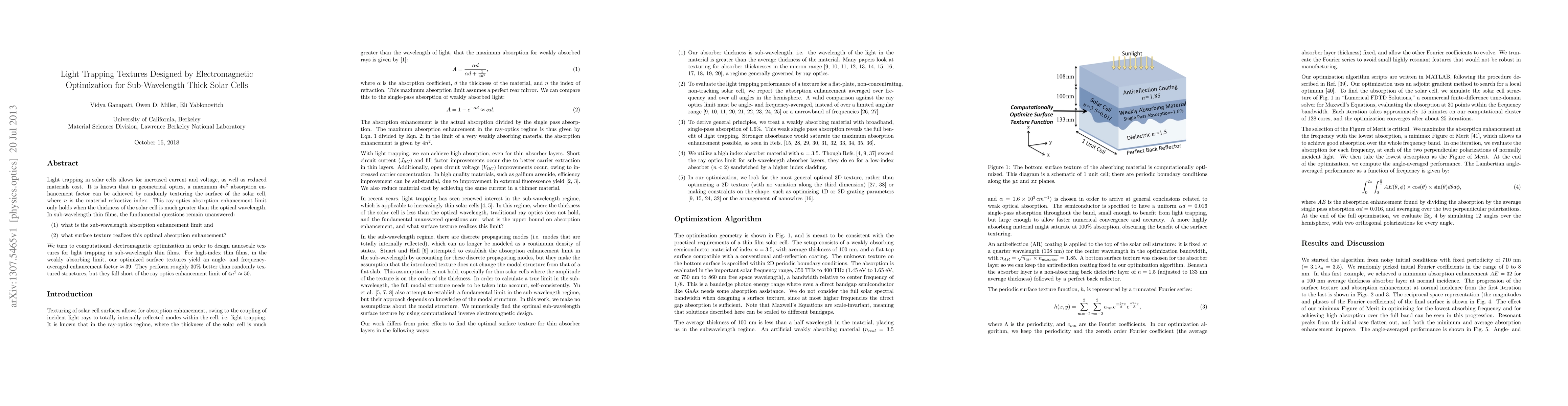 This paper explores the design of light trapping textures using electromagnetic optimization for sub-wavelength thick solar cells, achieving an absorption enhancement factor of ~39, which is 30% better than random textures but falls short of the ray optics limit.
