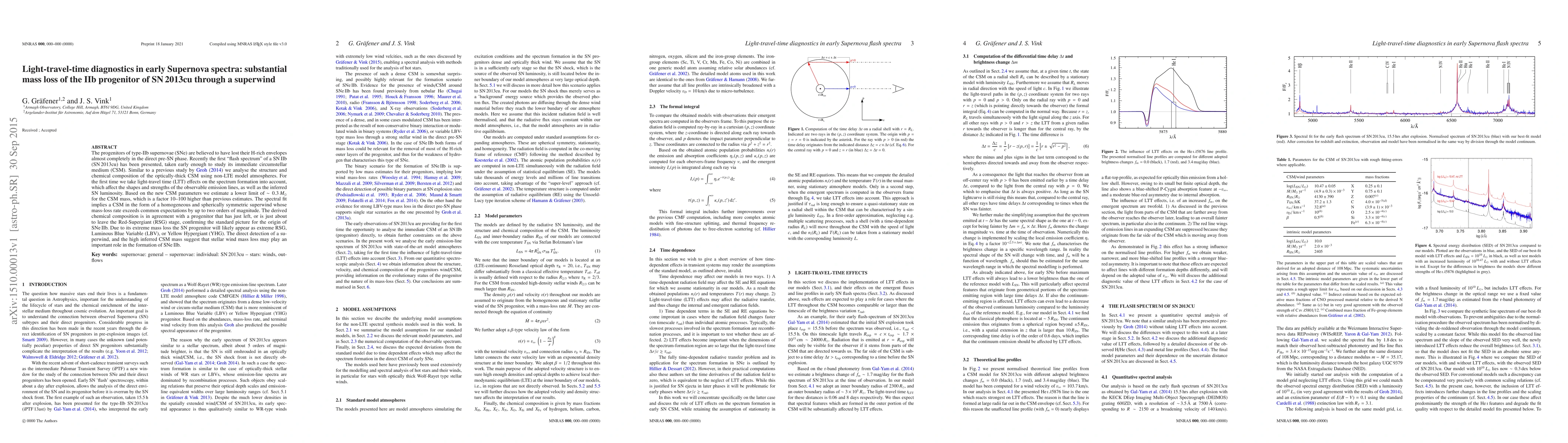 The progenitors of type-IIb supernovae (SNe) are believed to have lost their H-rich envelopes almost completely in the direct pre-SN phase. Recently the first 'flash spectrum' of a SN IIb (SN2013cu) has been presented, taken early enough to study its immediate circumstellar medium (CSM). Similar to a previous study by Groh (2014) we analyse the structure and chemical composition of the optically-thick CSM using non-LTE model atmospheres. For the first time we take light-travel time (LTT) effects on the spectrum formation into account, which affect the shapes and strengths of the observable emission lines, as well as the inferred SN luminosity. Based on the new CSM parameters we estimate a lower limit of ~0.3Msun for the CSM mass, which is a factor 10-100 higher than previous estimates. The spectral fit implies a CSM in the form of a homogeneous and spherically symmetric superwind whose mass-loss rate exceeds common expectations by up to two orders of magnitude. The derived chemical composition is in agreement with a progenitor that has just left, or is just about to leave the Red-Supergiant (RSG) stage, confirming the standard picture for the origin of SNe IIb. Due to its extreme mass loss the SN progenitor will likely appear as extreme RSG, Luminous Blue Variable (LBV), or Yellow Hypergiant (YHG). The direct detection of a superwind, and the high inferred CSM mass suggest that stellar wind mass loss may play an important role in the formation of SNe IIb.