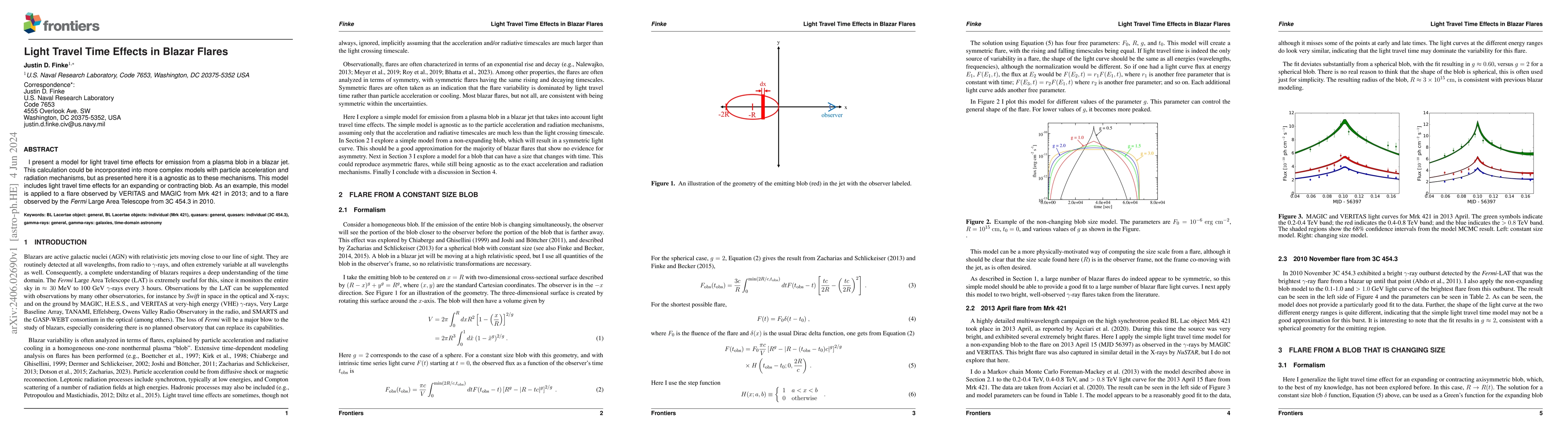 This research presents a model for light travel time effects in blazar flares, focusing on emission from plasma blobs in jet scenarios. The model is applied to flares from Mrk 421 and 3C 454.3, illustrating its utility in analyzing relativistic jet dynamics.