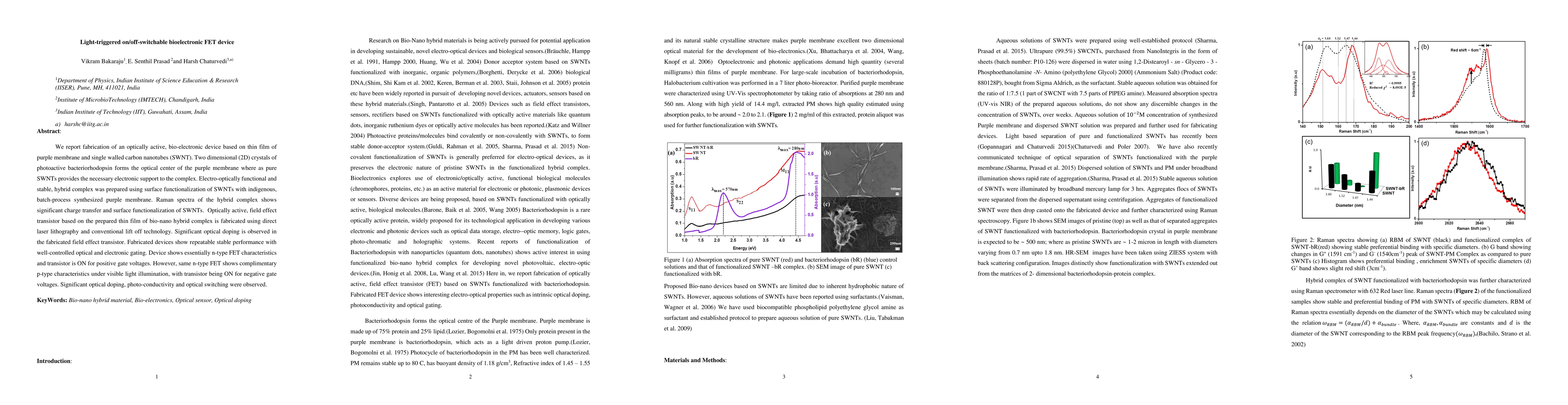 We report fabrication of an optically active, bio-electronic device based on thin film of purple membrane and single walled carbon nanotubes (SWNT). Two dimensional (2D) crystals of photoactive bacteriorhodopsin forms the optical center of the purple membrane where as pure SWNTs provides the necessary electronic support to the complex. Electro-optically functional and stable, hybrid complex was prepared using surface functionalization of SWNTs with indigenous, batch-process synthesized purple membrane. Raman spectra of the hybrid complex shows significant charge transfer and surface functionalization of SWNTs. Optically active, field effect transistor based on the prepared thin film of bio-nano hybrid complex is fabricated using direct laser lithography and conventional lift off technology. Significant optical doping is observed in the fabricated field effect transistor. Fabricated devices show repeatable stable performance with well-controlled optical and electronic gating. Device shows essentially n-type FET characteristics and transistor is ON for positive gate voltages. However, same n-type FET shows complimentary p-type characteristics under visible light illumination, with transistor being ON for negative gate voltages. Significant optical doping, photo-conductivity and optical switching were observed.