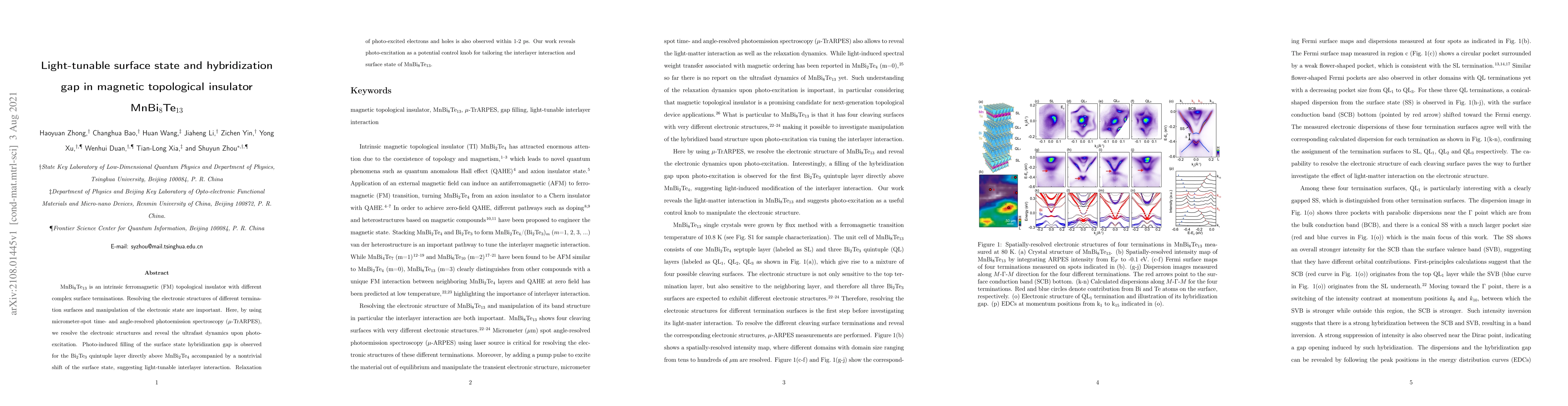 MnBi$_8$Te$_{13}$ is an intrinsic ferromagnetic (FM) topological insulator with different complex surface terminations. Resolving the electronic structures of different termination surfaces and manipulation of the electronic state are important. Here, by using micrometer spot time- and angle-resolved photoemission spectroscopy ($\mu$-TrARPES), we resolve the electronic structures and reveal the ultrafast dynamics upon photoexcitation. Photoinduced filling of the surface state hybridization gap is observed for the Bi$_2$Te$_3$ quintuple layer directly above MnBi$_2$Te$_4$ accompanied by a nontrivial shift of the surface state, suggesting light-tunable interlayer interaction. Relaxation of photoexcited electrons and holes is observed within 1-2 ps. Our work reveals photoexcitation as a potential control knob for tailoring the interlayer interaction and surface state of MnBi$_8$Te$_{13}$.