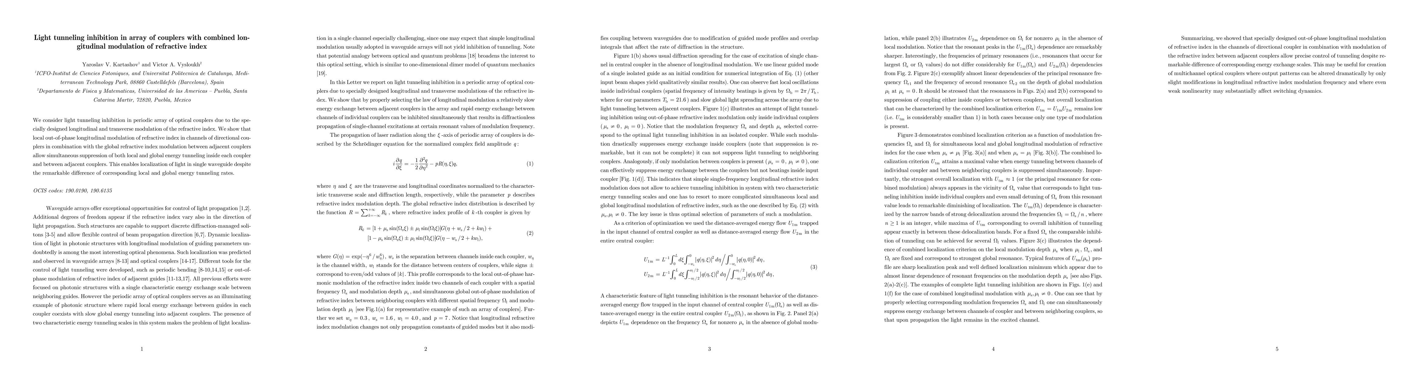 This study investigates light tunneling inhibition in an array of optical couplers through combined longitudinal and transverse modulation of the refractive index. It demonstrates that specific out-of-phase longitudinal modulation, alongside global modulation between couplers, can suppress both local and global energy tunneling, effectively localizing light in a single waveguide.