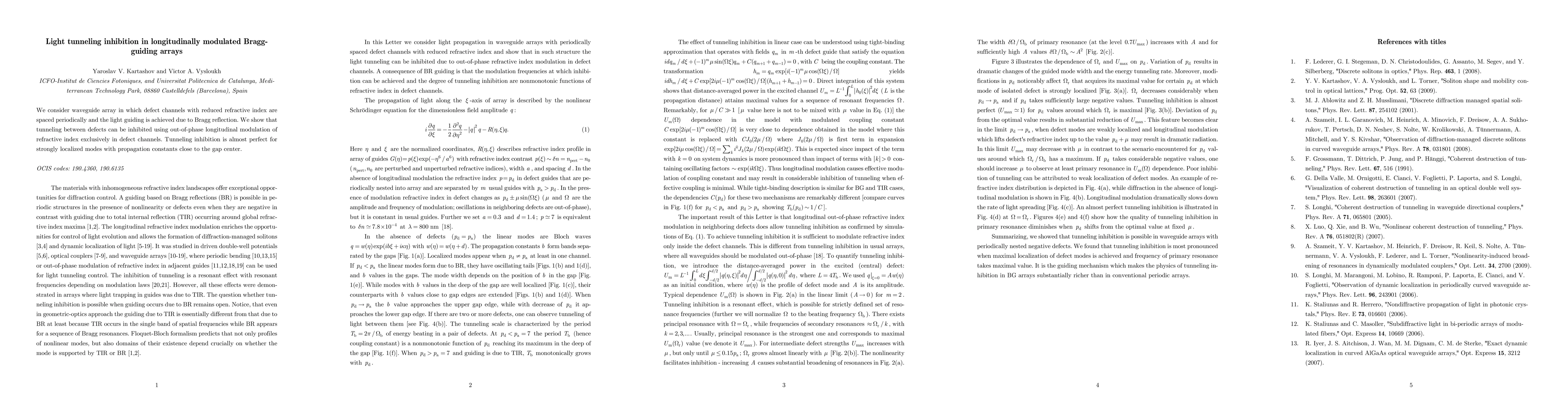 This paper investigates a waveguide array with periodically spaced defect channels to achieve light guidance via Bragg reflection. The authors demonstrate that tunneling between defect channels can be almost perfectly inhibited by applying out-of-phase longitudinal modulation of the refractive index only in the defect channels, particularly for strongly localized modes near the gap center.