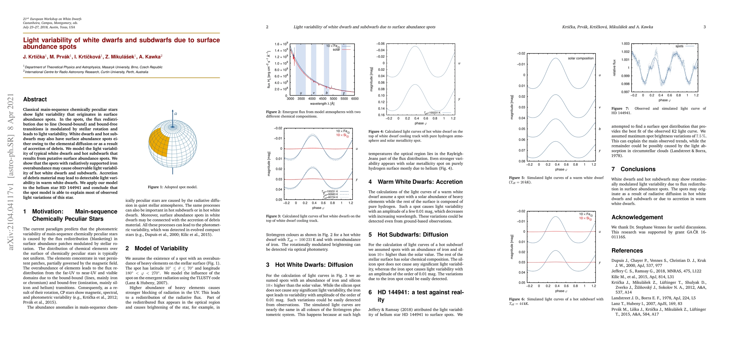 Research shows that surface abundance spots on white dwarfs and subdwarfs can cause light variability due to stellar rotation and element diffusion, which was confirmed in the case of helium star HD 144941.